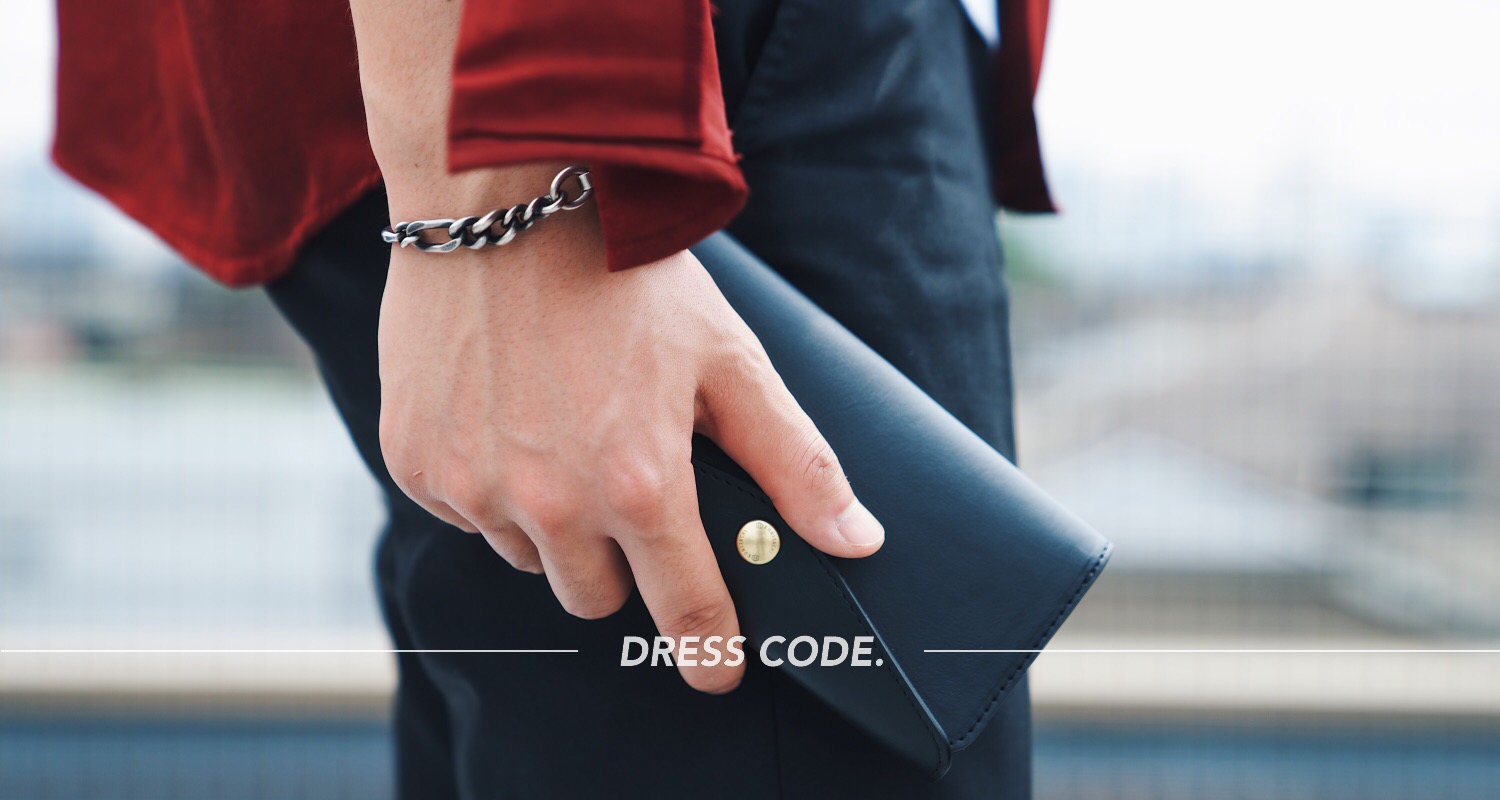 ケースの配色と合わせて、服装もモノトーンコーディネートに赤いボーリングシャツをアクセントにしました。革靴やシルバーアクセサリーなどとの相性もよく、我ながら国立商店のケースにハマった良いスタイルだと思います。