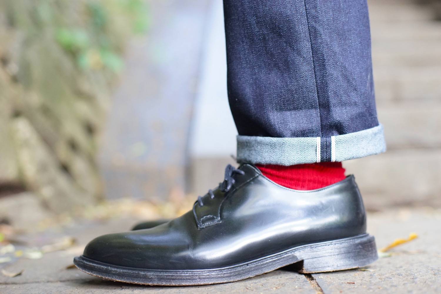足元は軽くロールアップしてUNIQLOの赤ソックスで。革靴は定番のチャーチSHANNON。