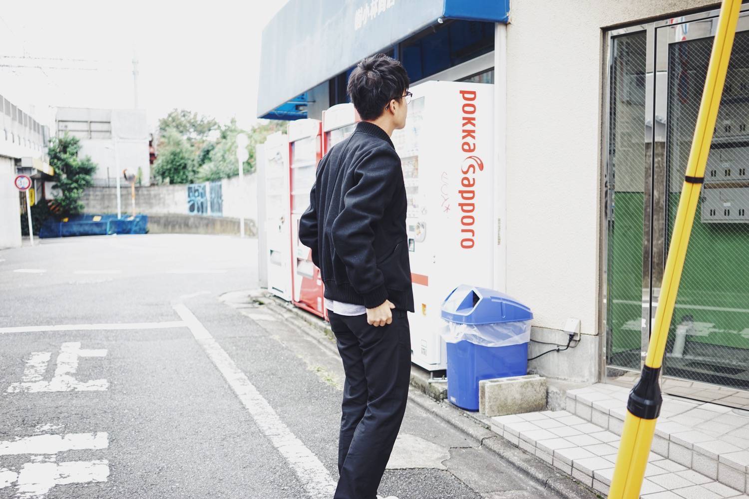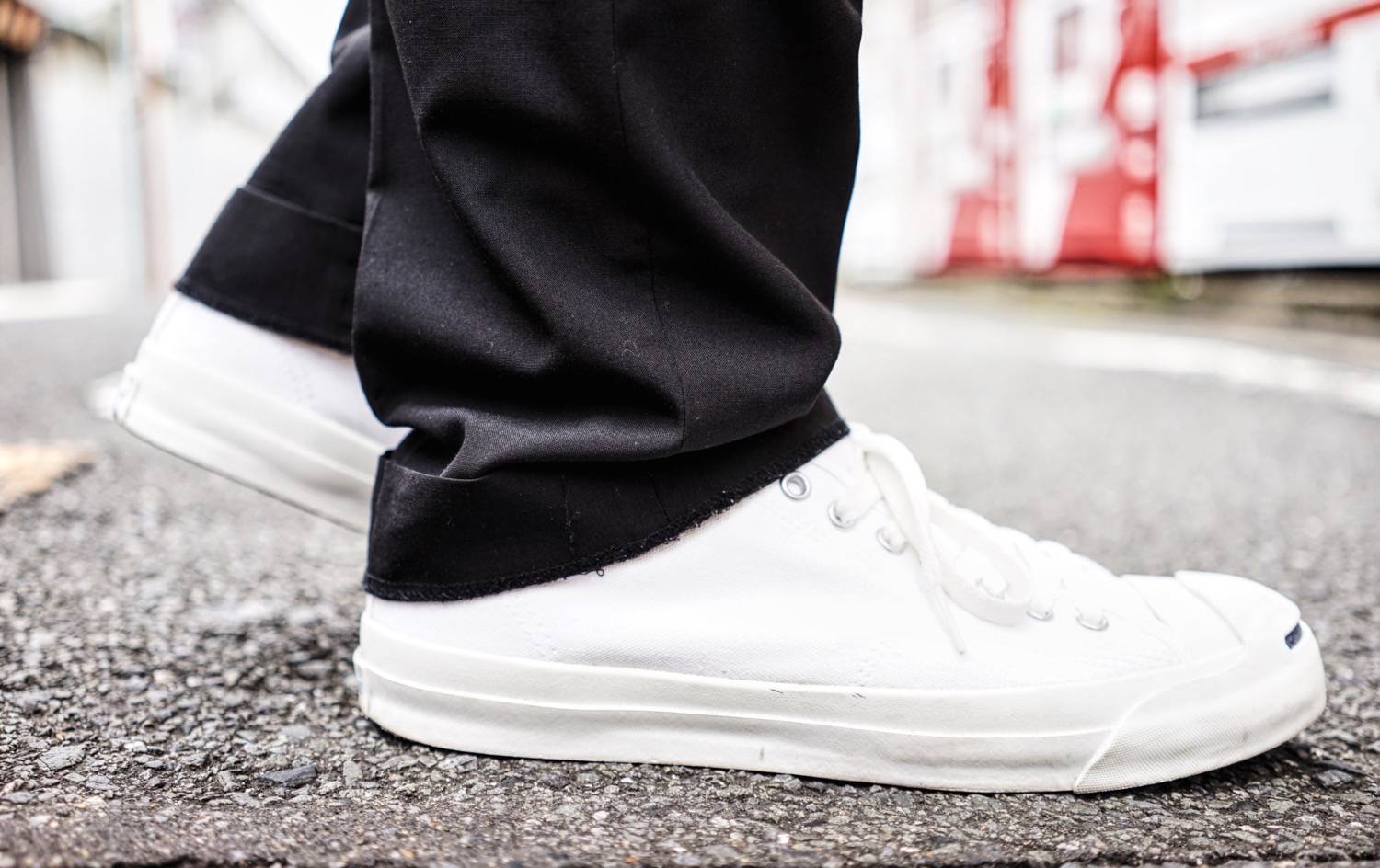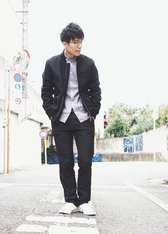 パンツはUNIQLOのスラックス、シューズはCONVERSEジャックパーセルの白で軽さを残しました。