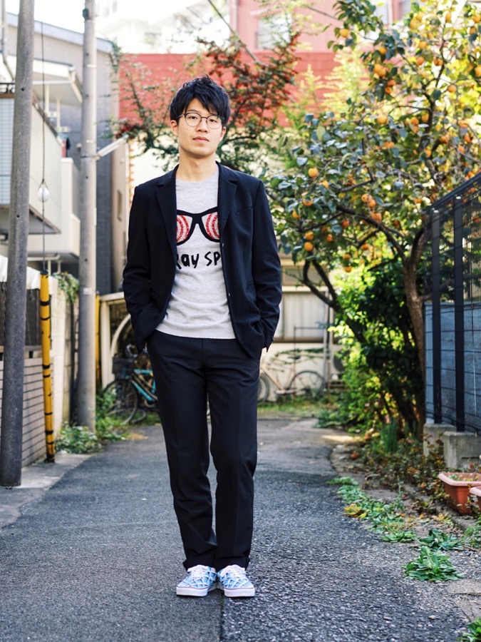 かっちりとしたスタイルにインナーとスニーカーでハズしを。インナーはイギリスのブランド「SIBLING」のぐるぐるメガネニット。目の中の赤いぐるぐる部分がスパンコールになっていて見た目の割に凝った作り。