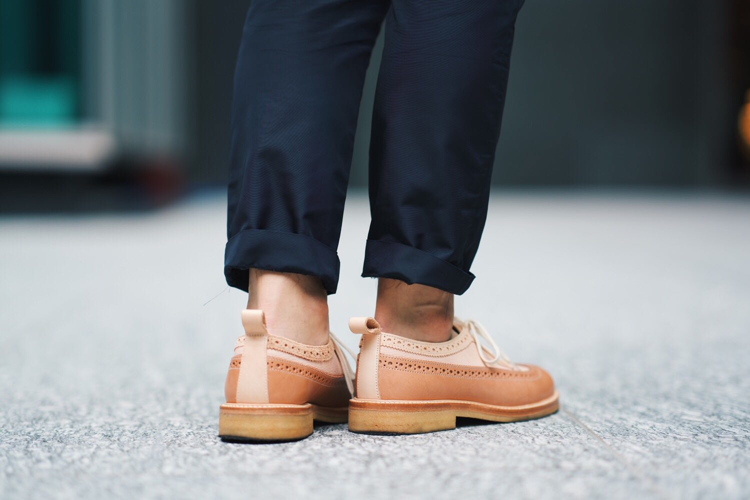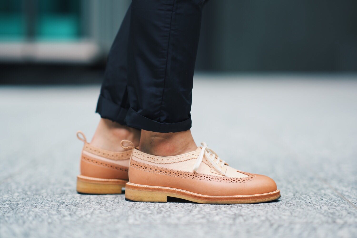 足元は買ったばかりでお気に入りのHender Schemeのシューズ。ウイングチップシューズは重いイメージで秋冬のファッションの方が映えますが、淡い色味のヌメ革なら夏でも爽やかに履けます。くるぶしを見せて軽やかに。
