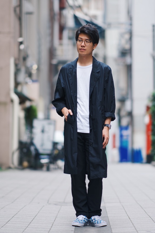 ゆっくりとした休日の今日は、Tシャツの上からダスターコートを軽く羽織ってリラックスしたコーディネート。秋の気候らしく日中は暑いくらいでも夕方になると一気に気温が下がったりと寒暖差が激しい日は、袖をロールアップできる薄手のコートが便利です。