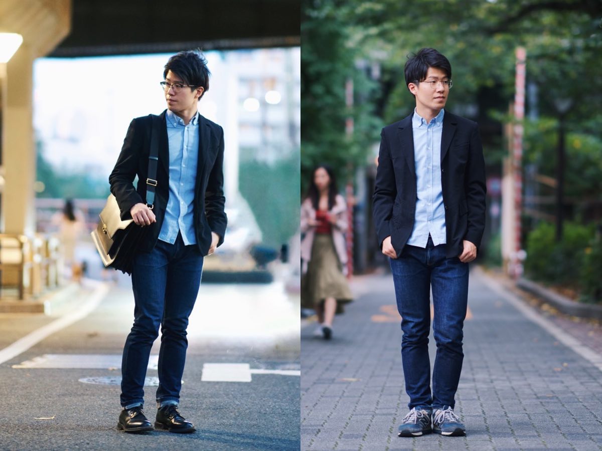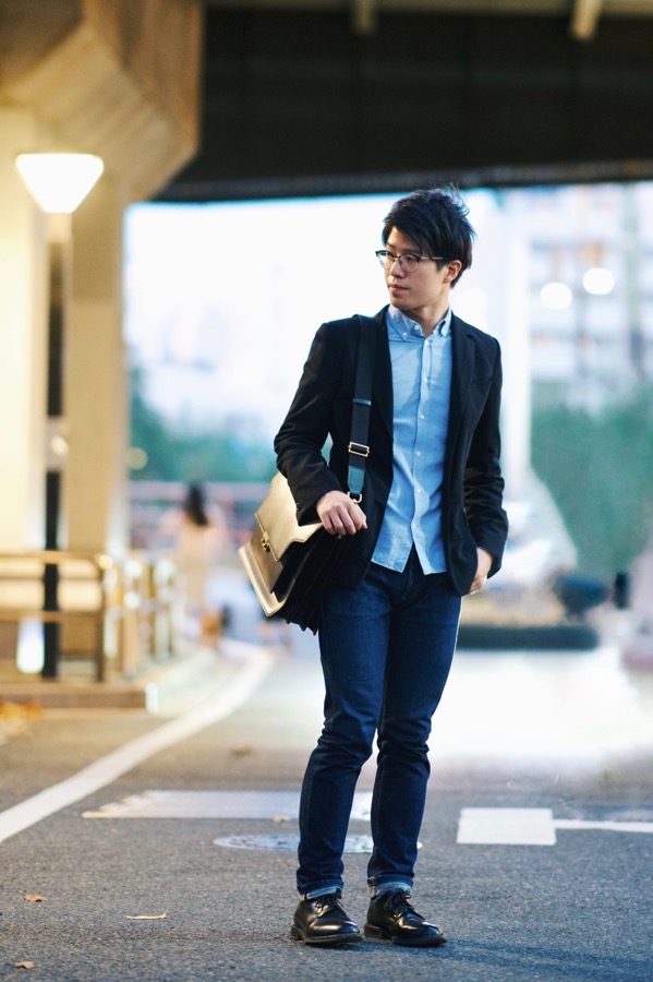 打ち合わせが立て込む今日はジャケットとシャツで比較的かっちりとした服装。デニムパンツも色落ちの少ないものを選びました。