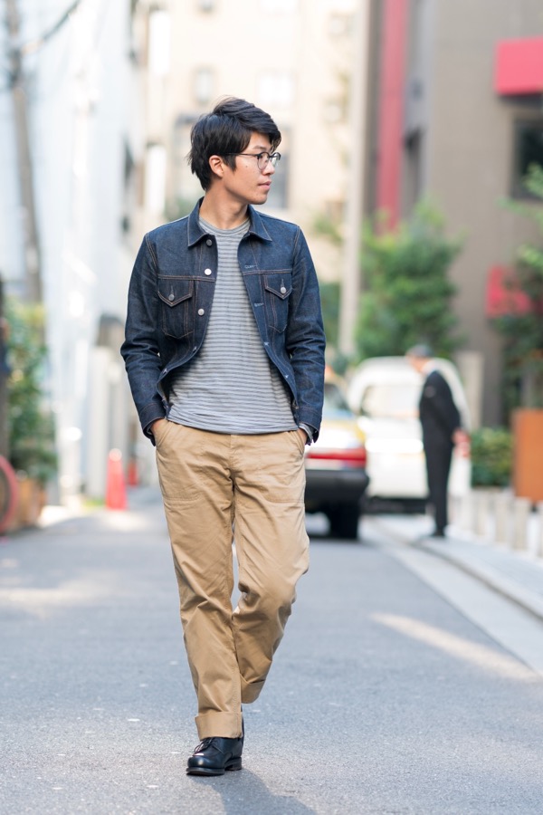 アイテムチョイスはデニムジャケットとチノパンというアメカジのド直球。ただリジッドデニムで細身なBLUE WORKのデニムジャケット、上品なワイドシルエットのJ.W.AndersonコラボのUNIQLOチノパンと、個別のアイテム自体はきれい目寄り。