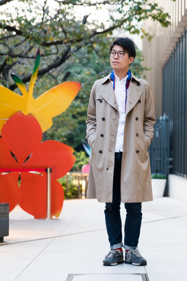 北風が強く吹いた昨日はbeautiful peopleのトレンチコートにライナー(裏地)を装着して真冬仕様に。細身のA.P.C.のリジッドデニムと合わせて縦長シルエットにしました。