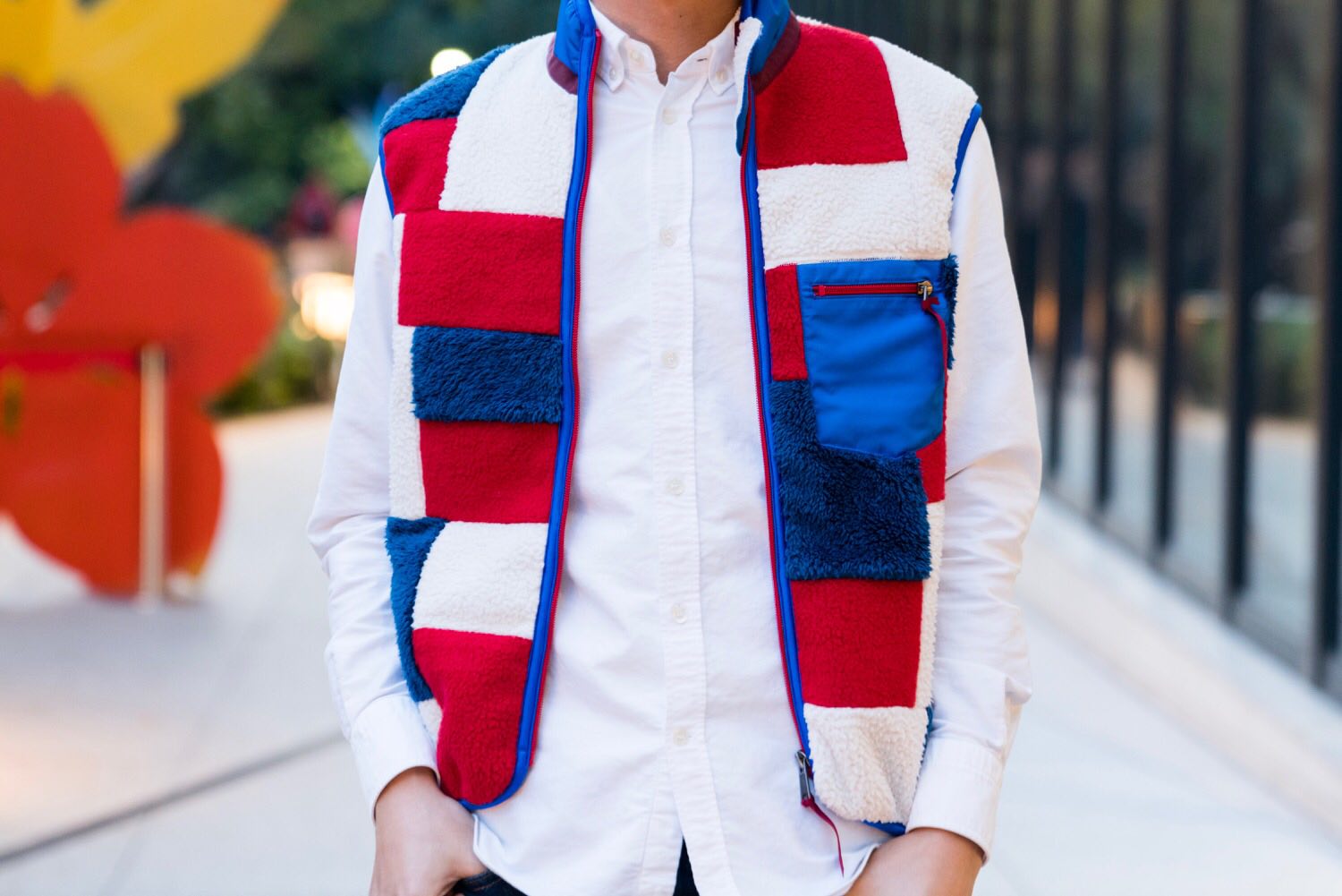 シャツにコートだとさすがに寒かったので、シャツの上からGANRYUのマルチカラーボアベストを着用。首元からチラッと見えるだけでコーディネートのポイントになってくれます。これからアウターをすっぽり着込んでしまう時期にも活躍してくれそう。