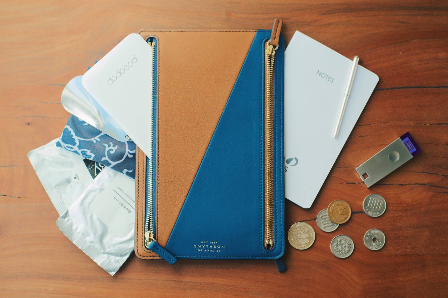 毎日使ってます、SMYTHSON(スマイソン)のカレンシーケース。通貨を入れ分けるための4つのポケットがついた薄い革小物入れですが、ここに日々持ち歩く細々したものを全て収納しています。
