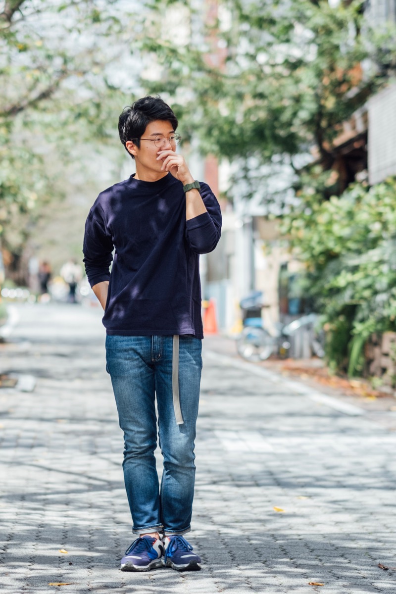 ゆったりとしたカットソーだけど、ダークネイビーの色味と首元のさりげないモックネックで1枚でも大人っぽく決まるのがお気に入り。