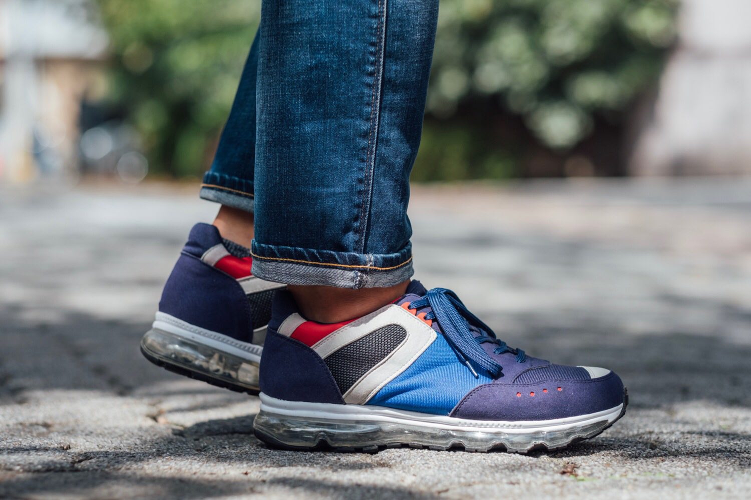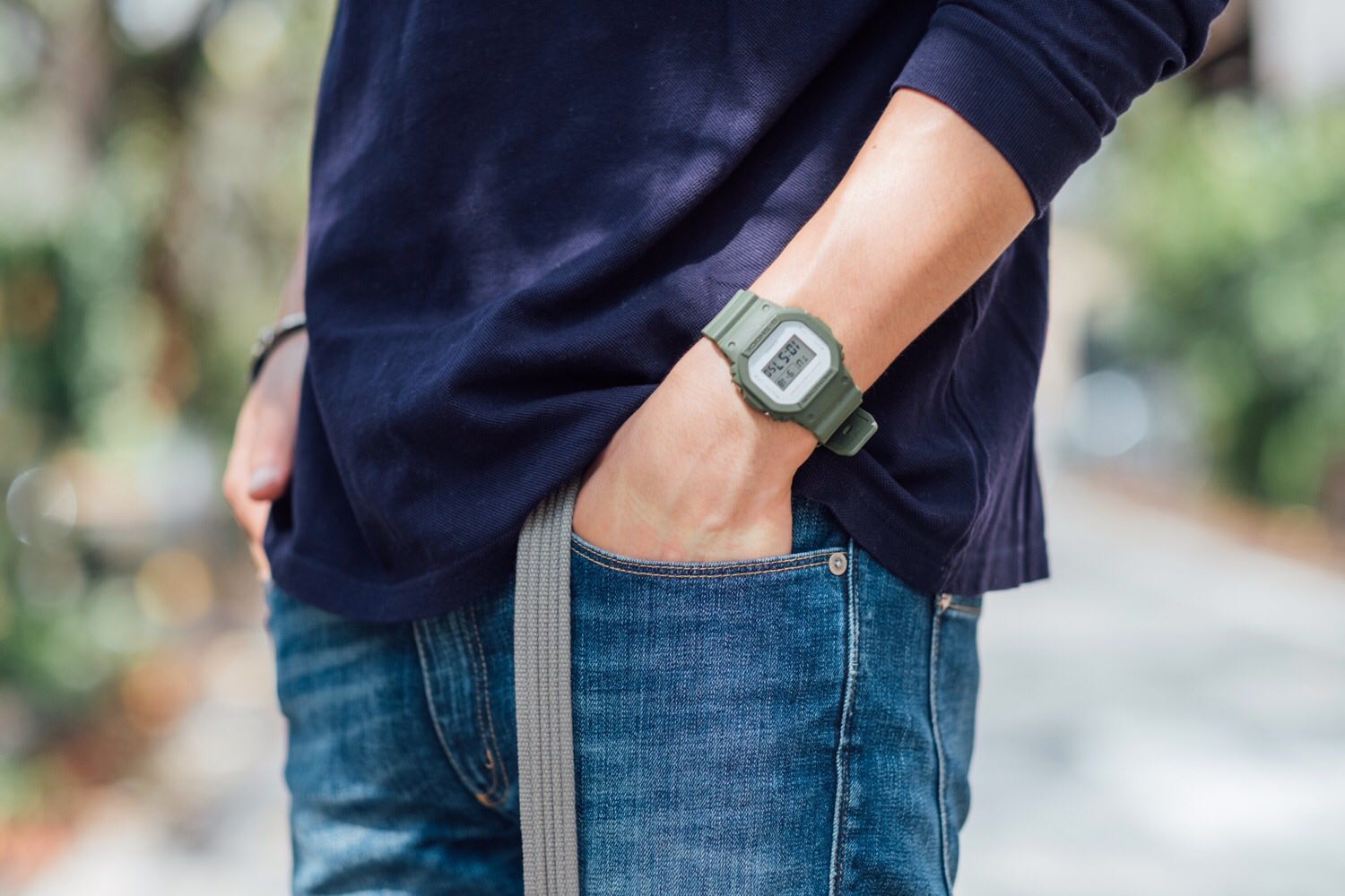 軍モノトップスに合わせてシューズはフレンチトレーナーをモチーフにしたTomo&Coのスニーカーをチョイス。腕時計もオリーブのG-SHOCKでリラックス感のあるミリタリーテイストを意識。