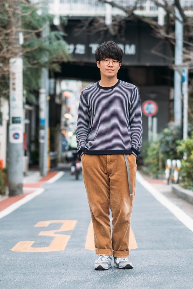 柔らかい印象のまま全体をまとめたかったので、靴はグレーのNewBalanceで。淡い色味とゆるいベージュのコーデュロイパンツの組み合わせが良い感じ。