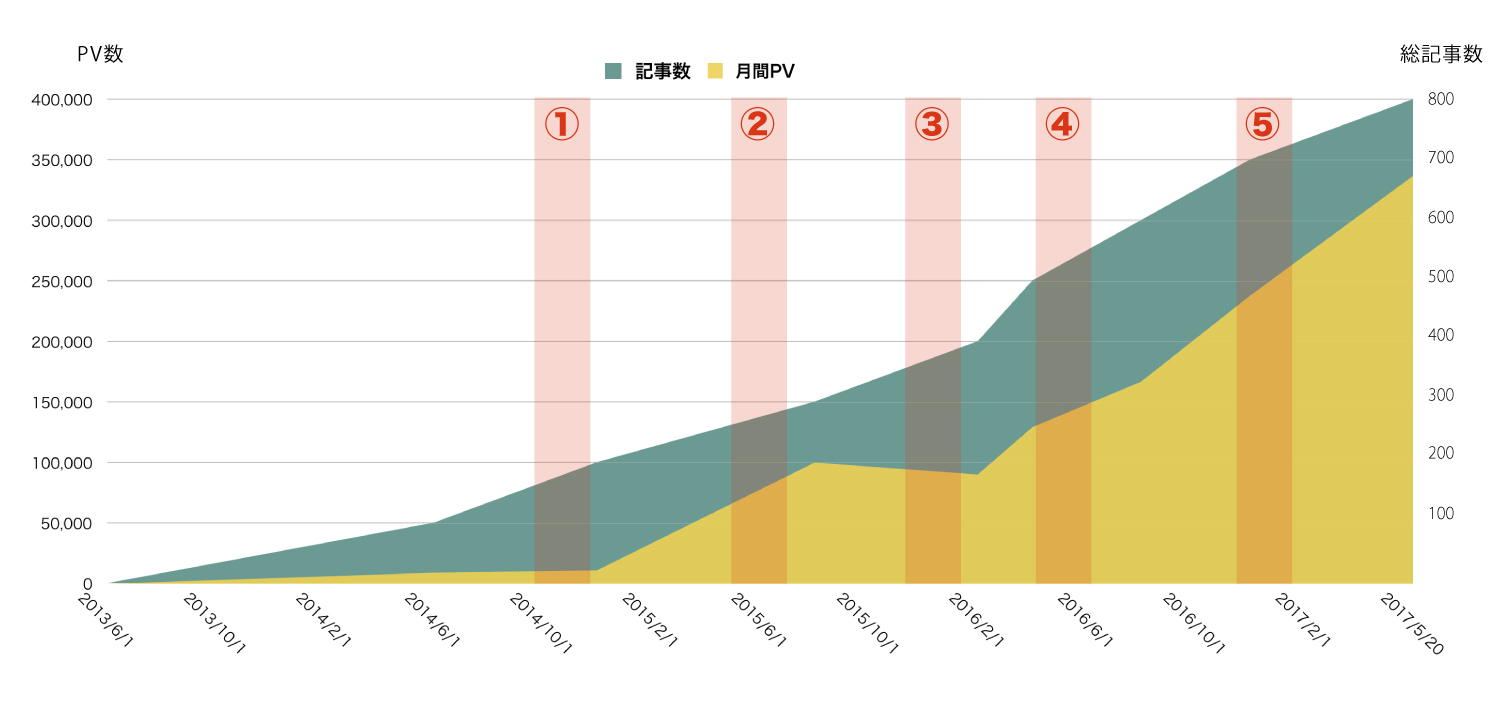 数字だけではつまらないので、大きく5つの時期に分けてそのとき考えていたことなどを簡単に書いていきます。ちなみに上のグラフは記事数・アクセス数共にスポットだけ計測してあとは適当に繋いでいるだけなので厳密に精緻ではありません。