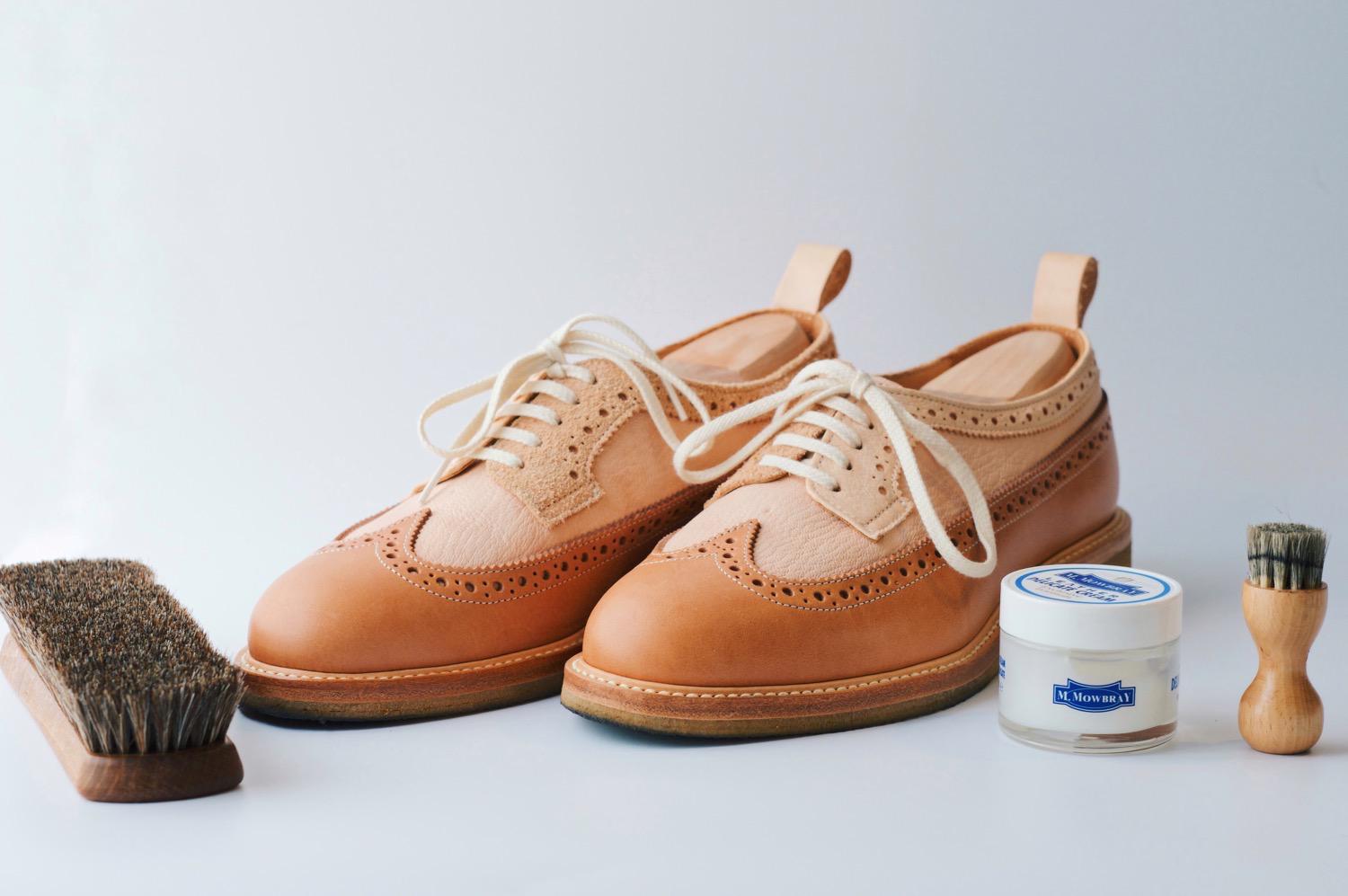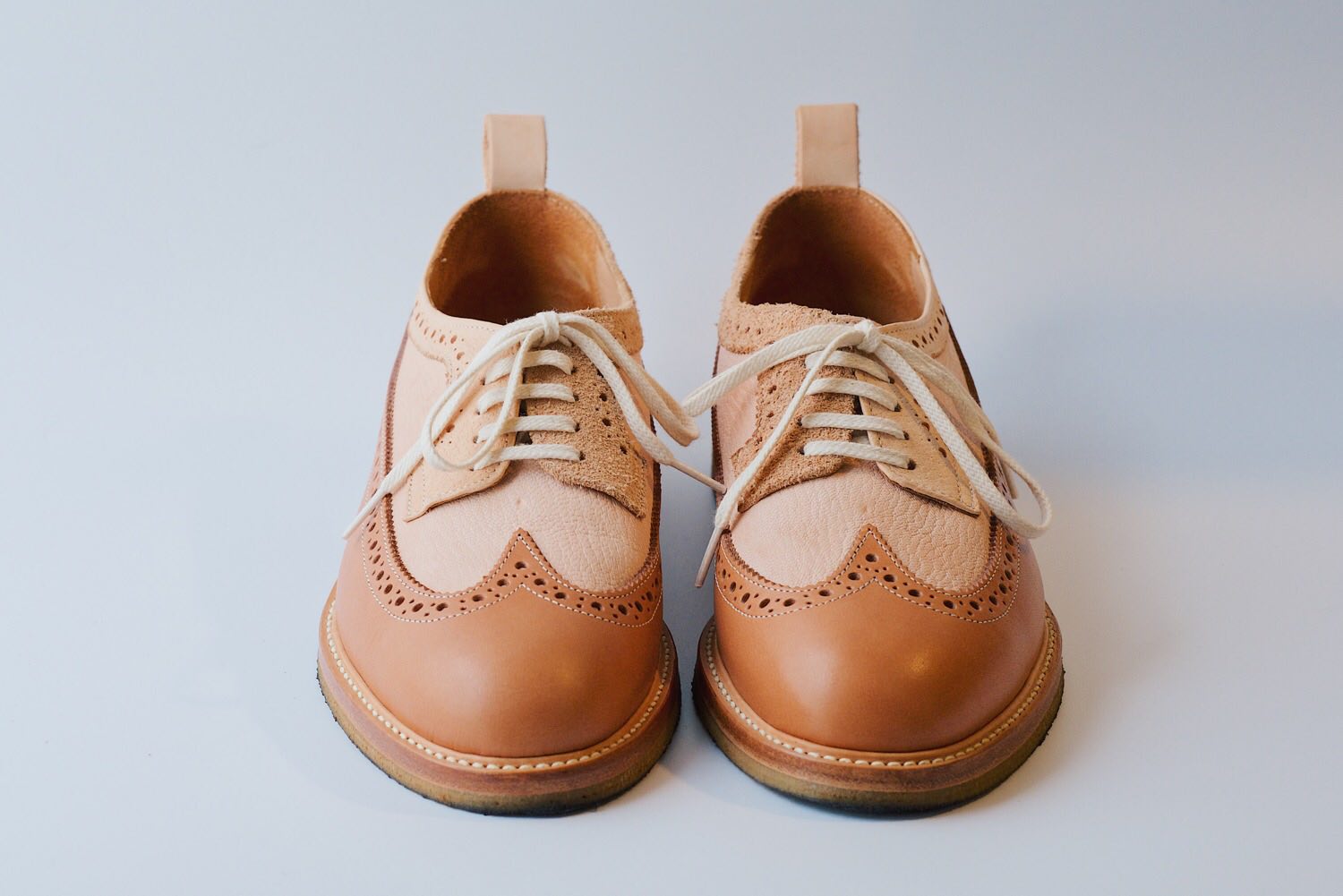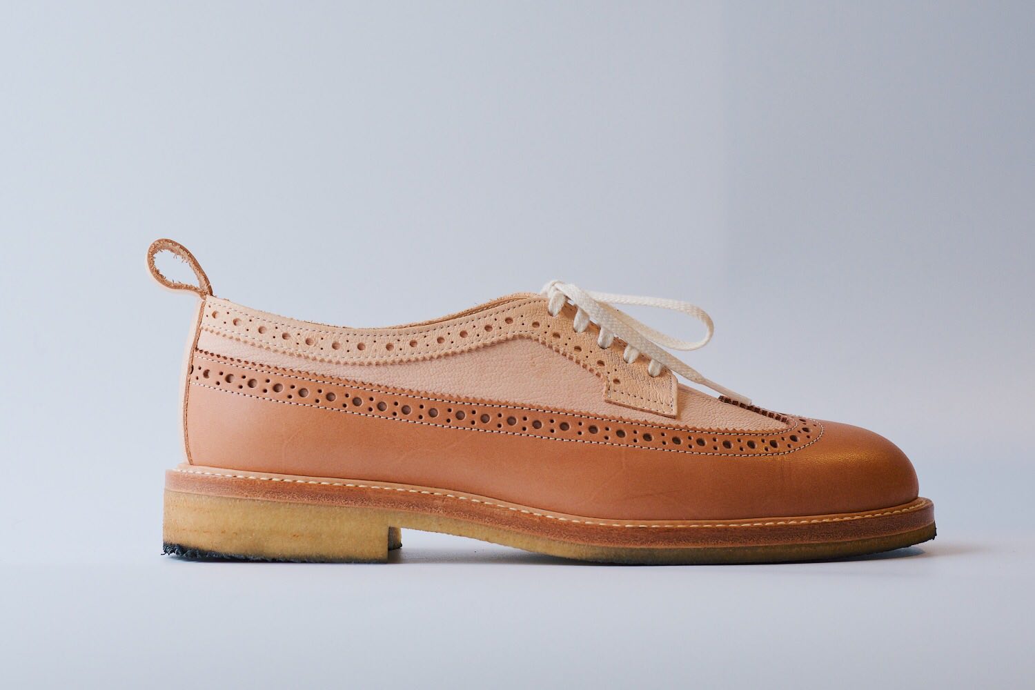 ウイングチップシューズのチャームポイントとも言える、サイドに伸びるブローギング。本来はどっしり重さのあるシューズですが、ヌメ革の淡い色味とクレープソールでこれから冬にかけて足元のポイントになってくれそうです。