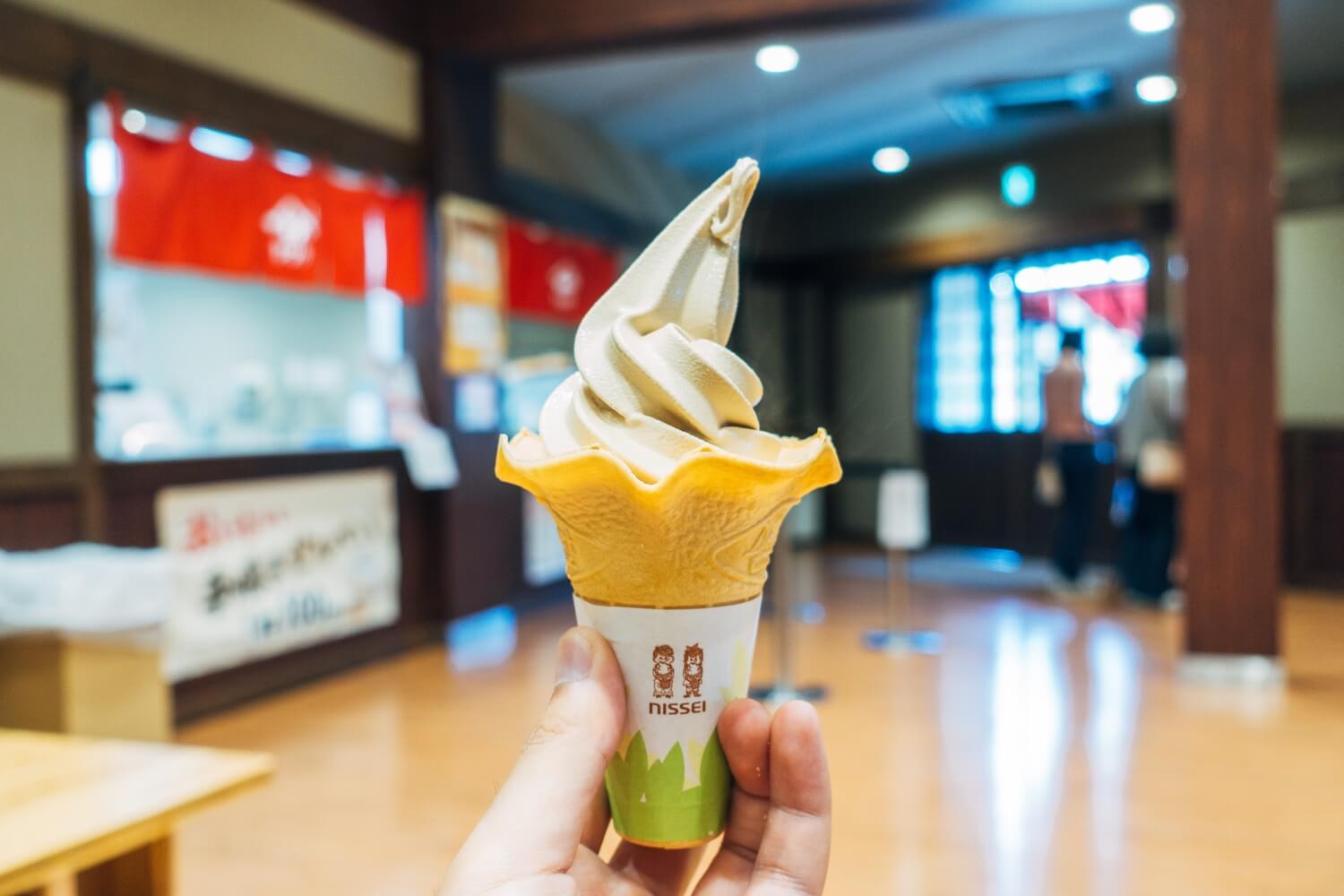 お目当てのしょうゆソフトをいただきます。ほんのりほろ苦さがあってコーヒークリームのような味で美味しかったです。