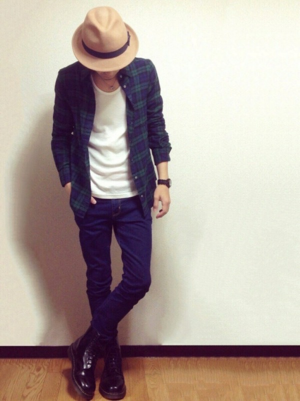 ハットとDr.Martinの8ホール、スキニーパンツにチェックシャツとロックを感じるコーディネート。