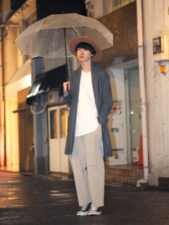 上下とも大きめのサイジングに設定し、色味もペールトーンでゆるい雰囲気に仕上げたコーディネート。