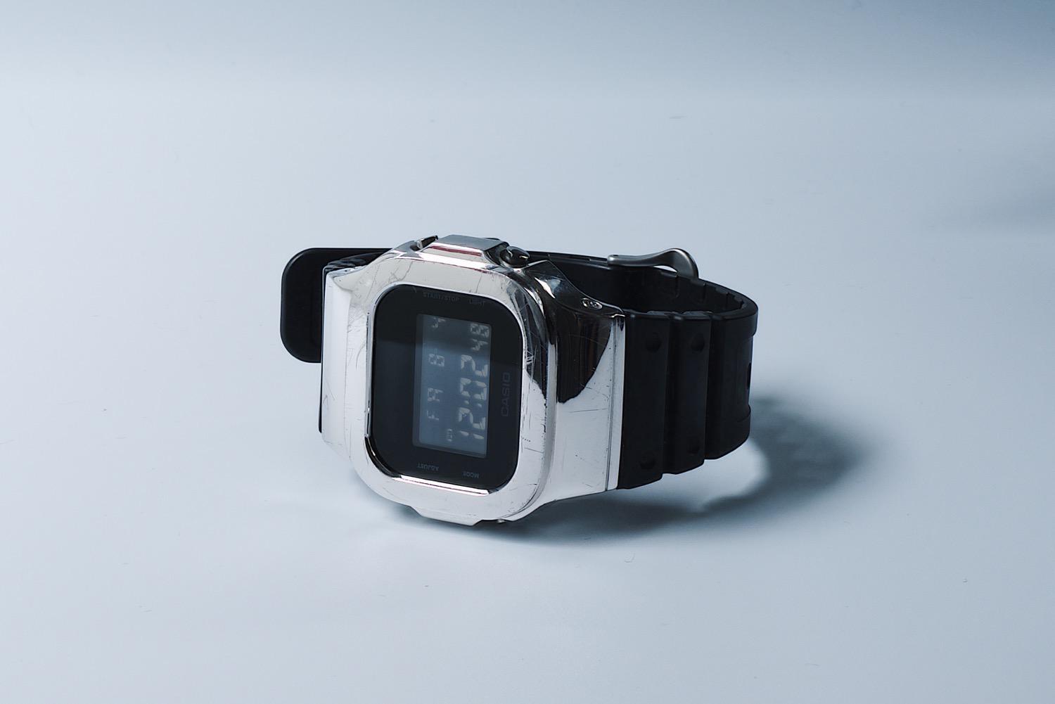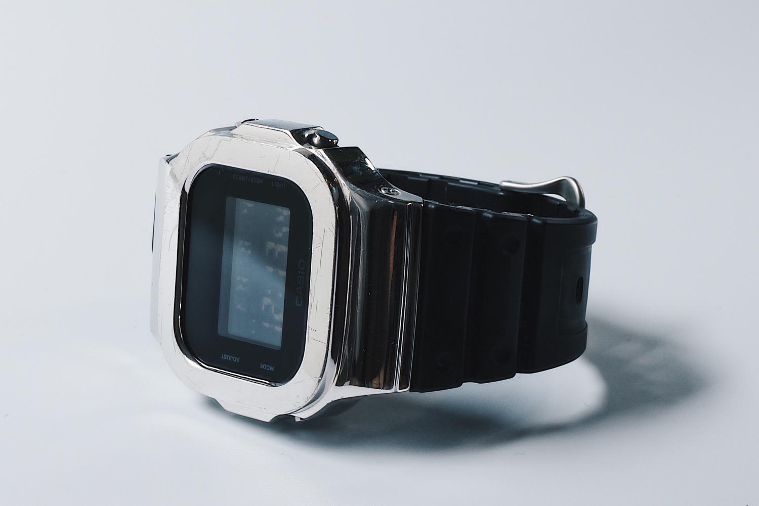 DAMUE Custom G-SHOCK。既存のG-SHOCKのフロントパーツを取り外し、オリジナルにデザインされたシルバーパーツをはめ込んだ特別な腕時計です。