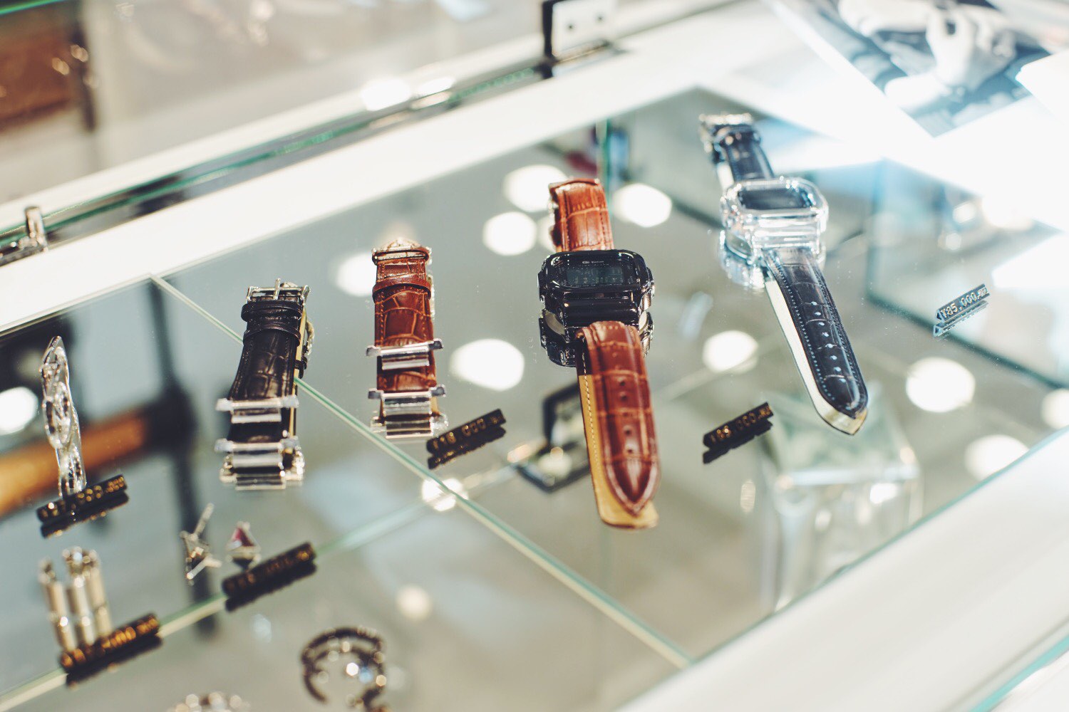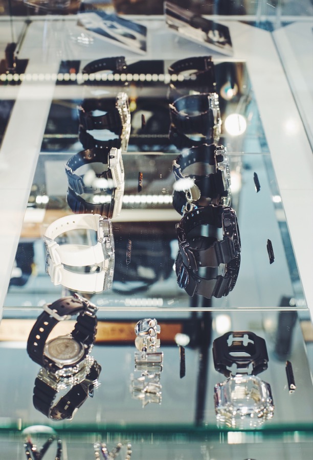 カスタムG-SHOCKのシルバーの輝きがミラーに反射し、ジュエリーショップのような雰囲気です。