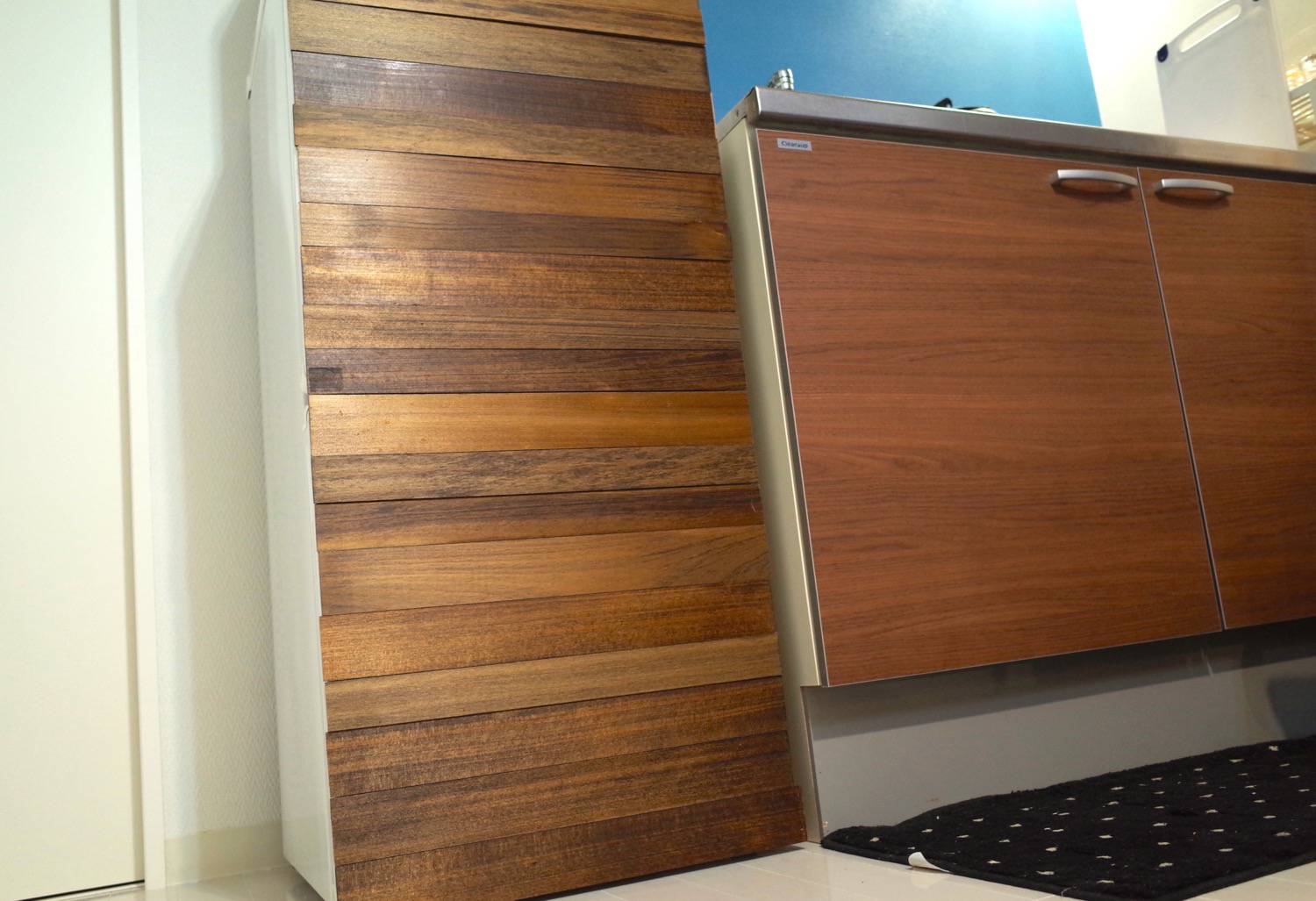 おしゃれに見せるポイントは木板の太さや色を微妙に変えてランダムに貼っていくこと。きっちり揃えるよりもあえて不揃いにする方が雰囲気がでます。