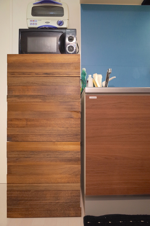 ぼくは無垢の木にシンクの戸棚と色を合わせるためエボニーのオイルを塗りました。お部屋の雰囲気に合わせて色をつけると統一感がでます。