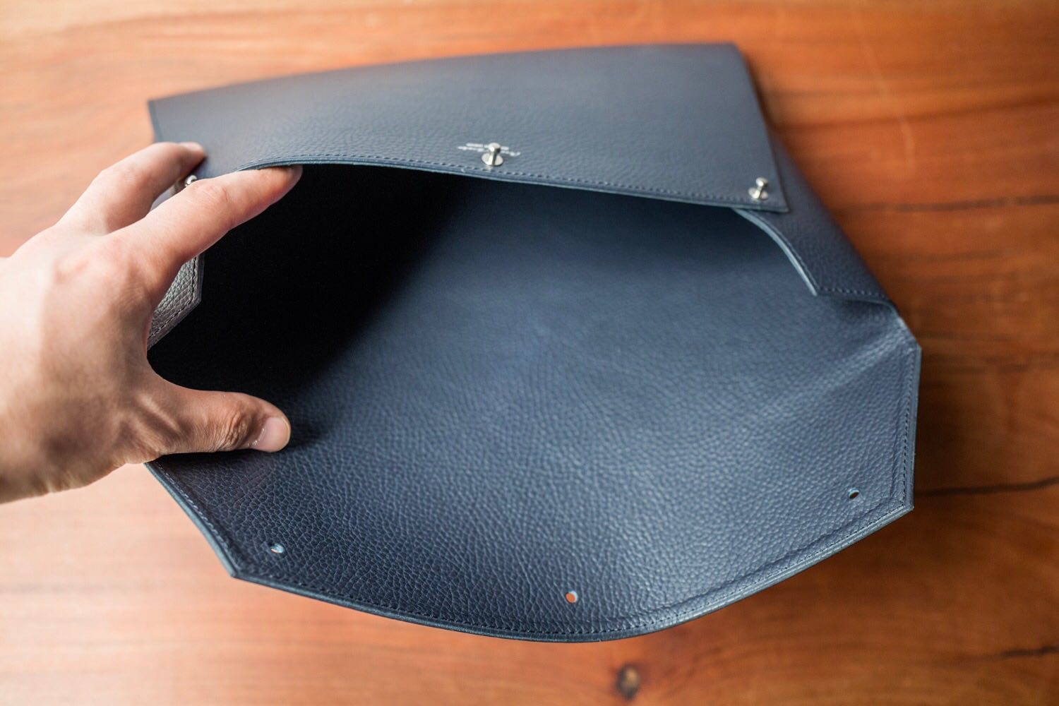 このエンベロープクラッチバッグの留め具はギボシという金属部品を、丸抜きされた穴に差し込むだけのシンプルな仕様。