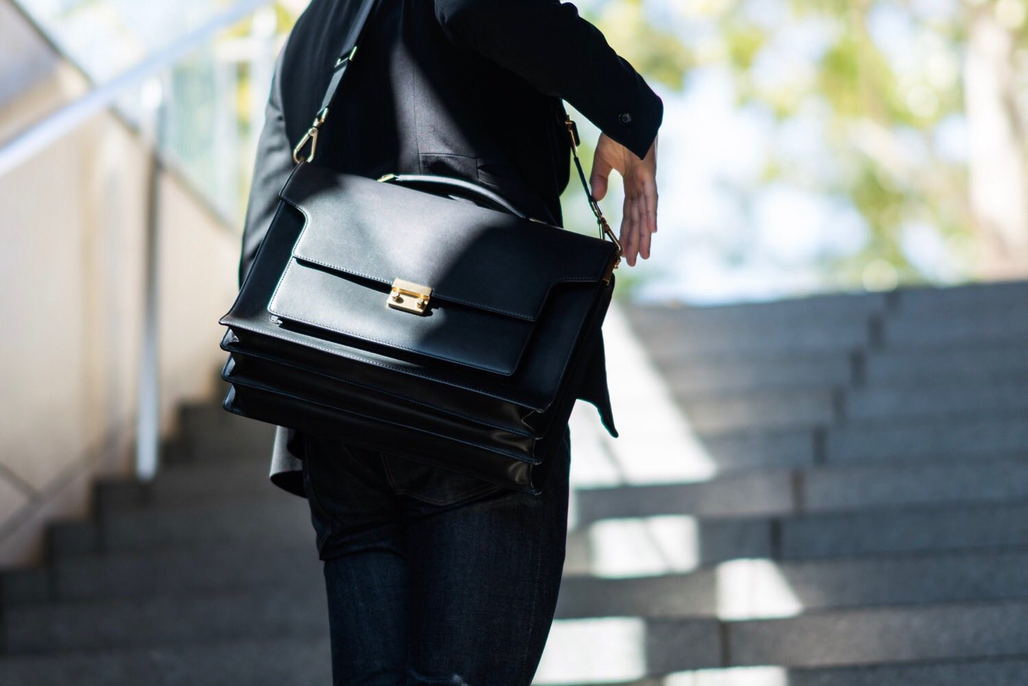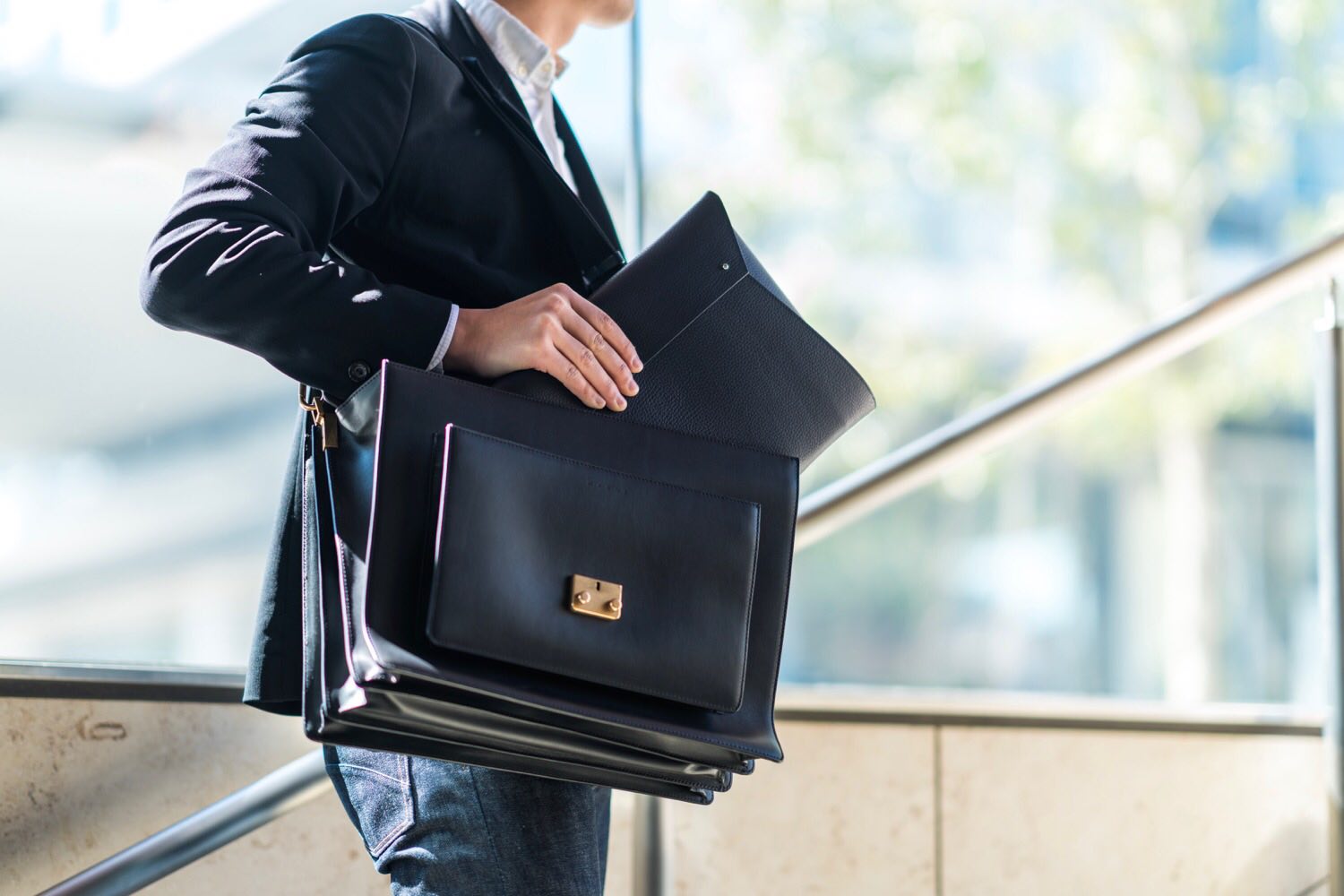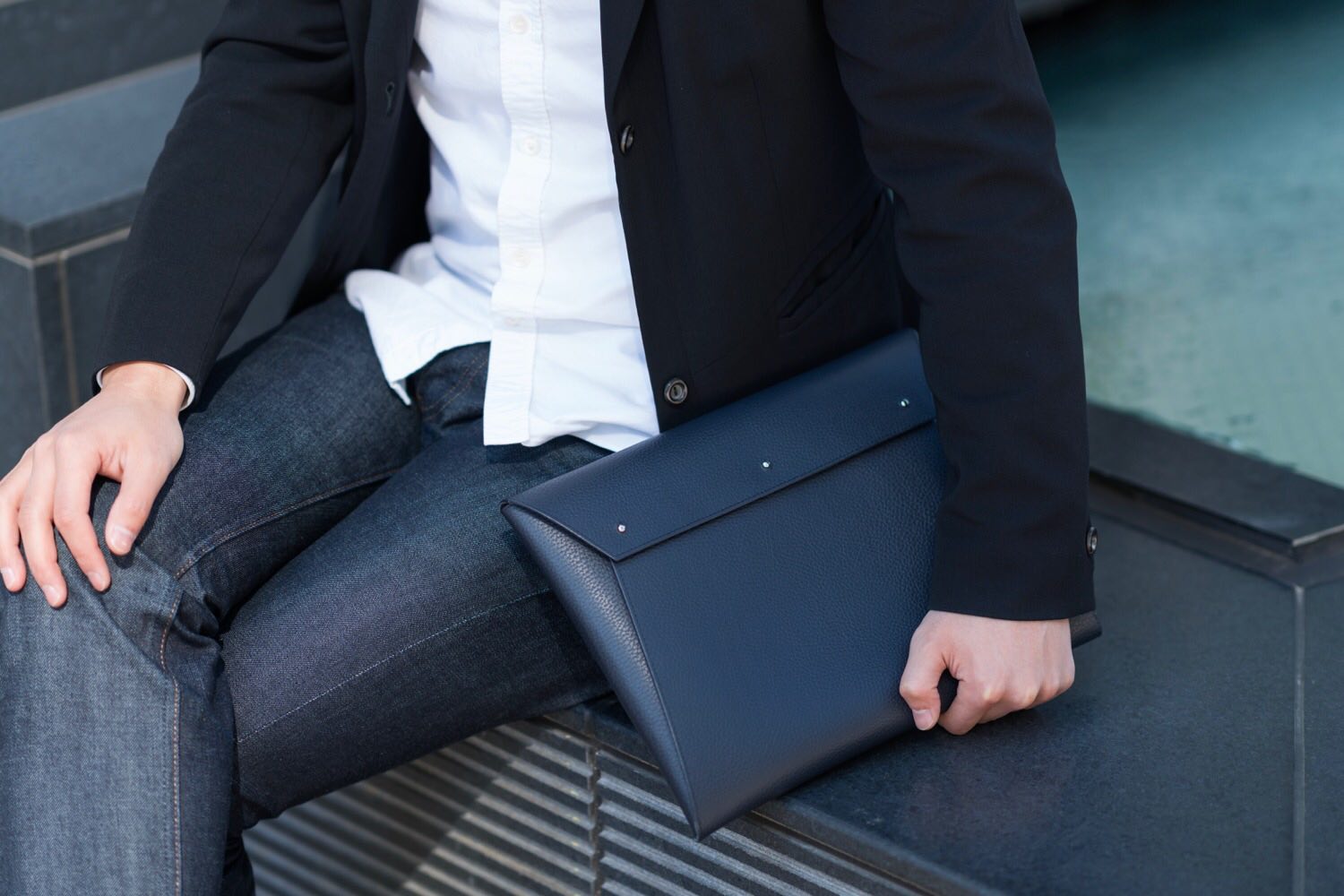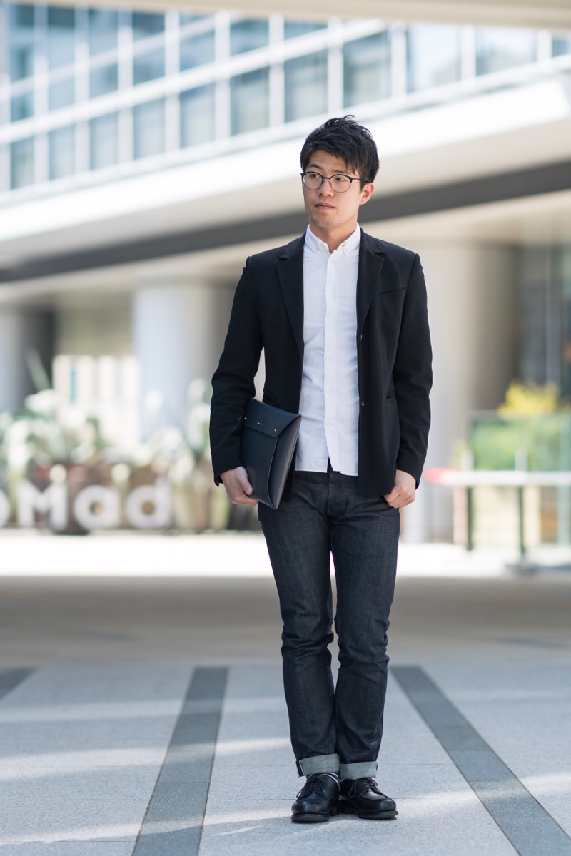 白シャツ+黒ジャケットのフォーマルな装いに合わせると、端正なバッグのデザインが一層香り立ちます。大人の男性が持つ色気を引き立ててくれるような気がします。