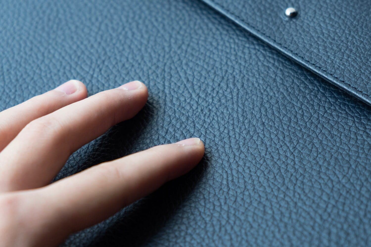 素材には「アドリアレザー」と呼ばれる、1958年創業のイタリア老舗タンナー・マエトロット社製の型押し牛革を使用。ビジネスシーンにも映える凛としたハリがありながら、手馴染みの良いソフトな質感の革素材です。