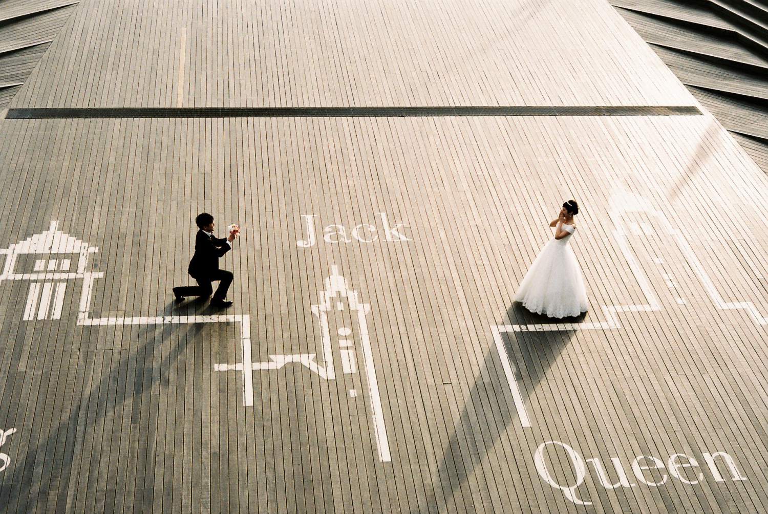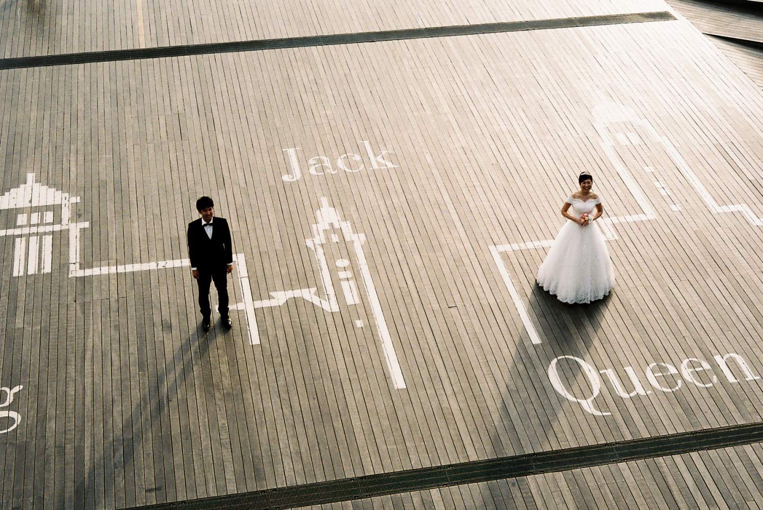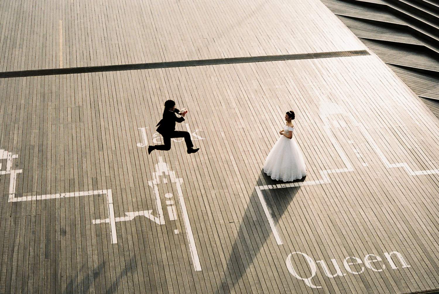人気が引くのを待ってウェディング姿で前撮りを始めるカップル。「マリオっぽくジャンプして!」とのカメラマンの指示にきっちり応える男性。
