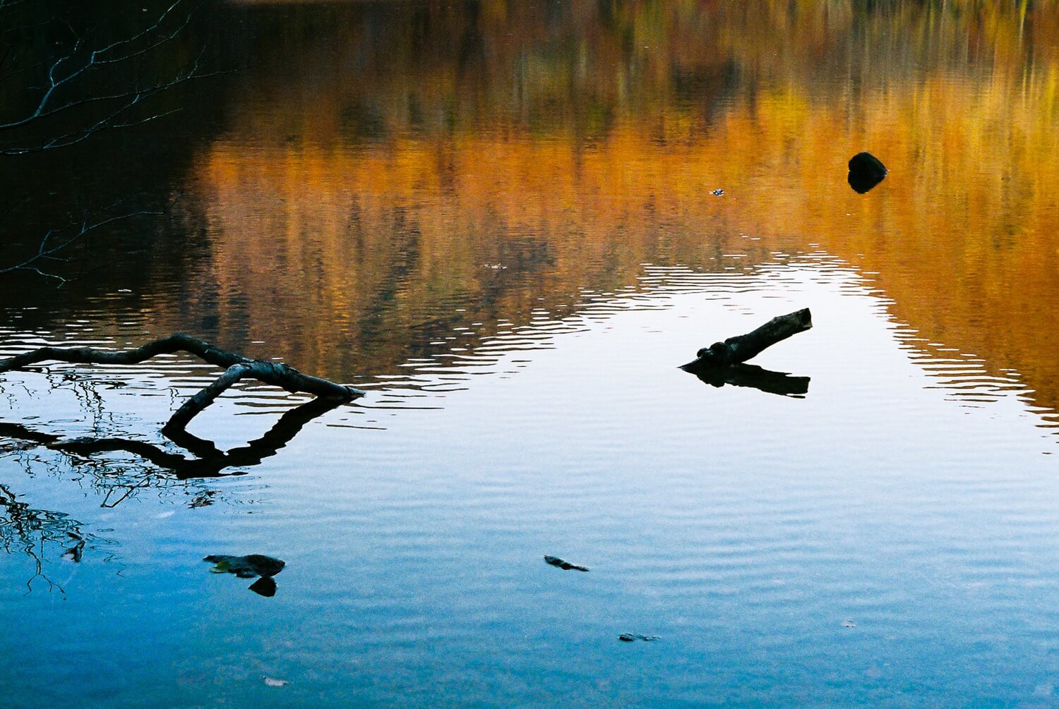 辿り着いたそこで見たのは朝日で木々が燃えるように色づき、その木々が水面を赤く染める神秘的な様子。この時ばかりはもっと広角なレンズが欲しいなと思いました。