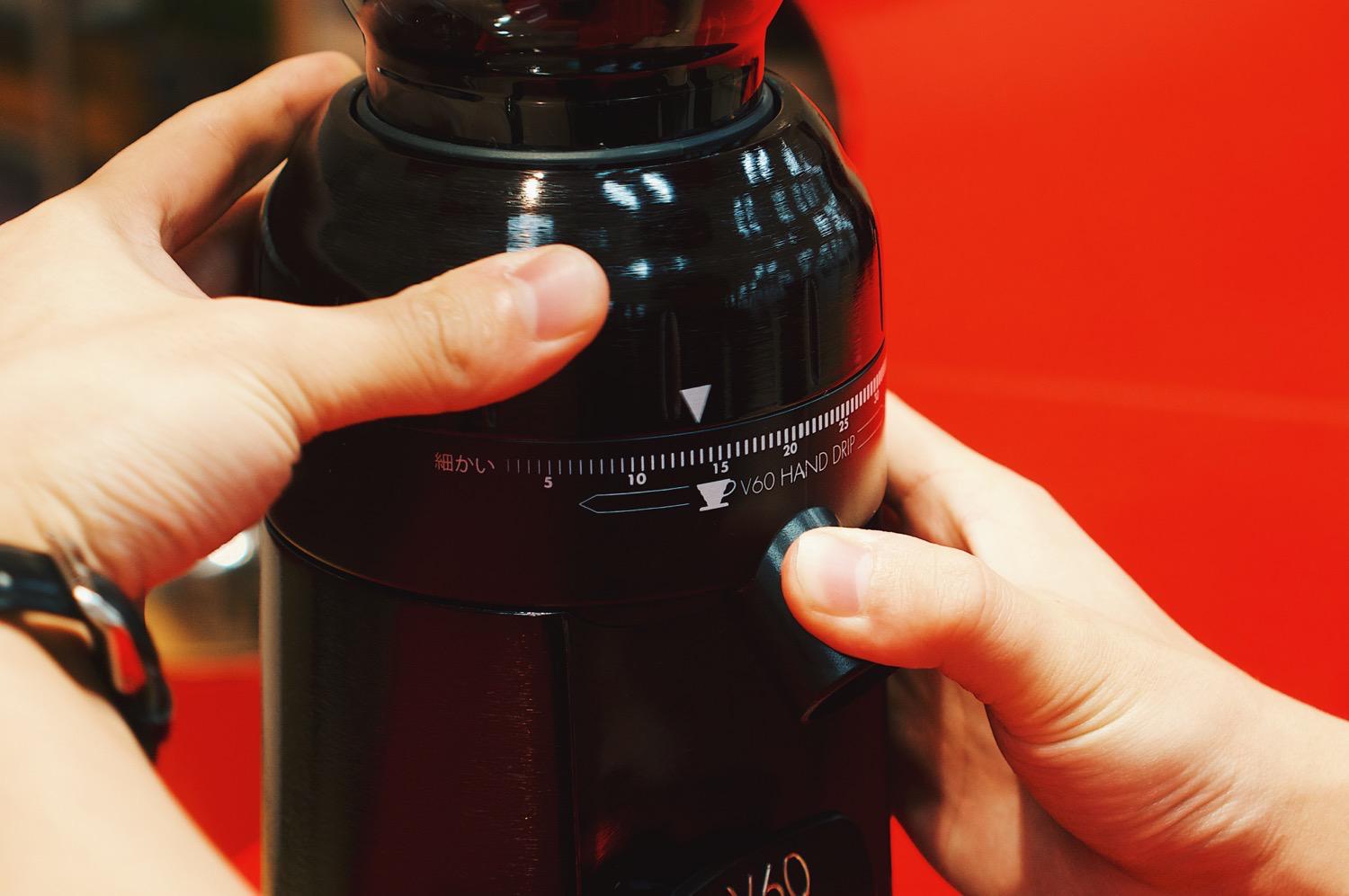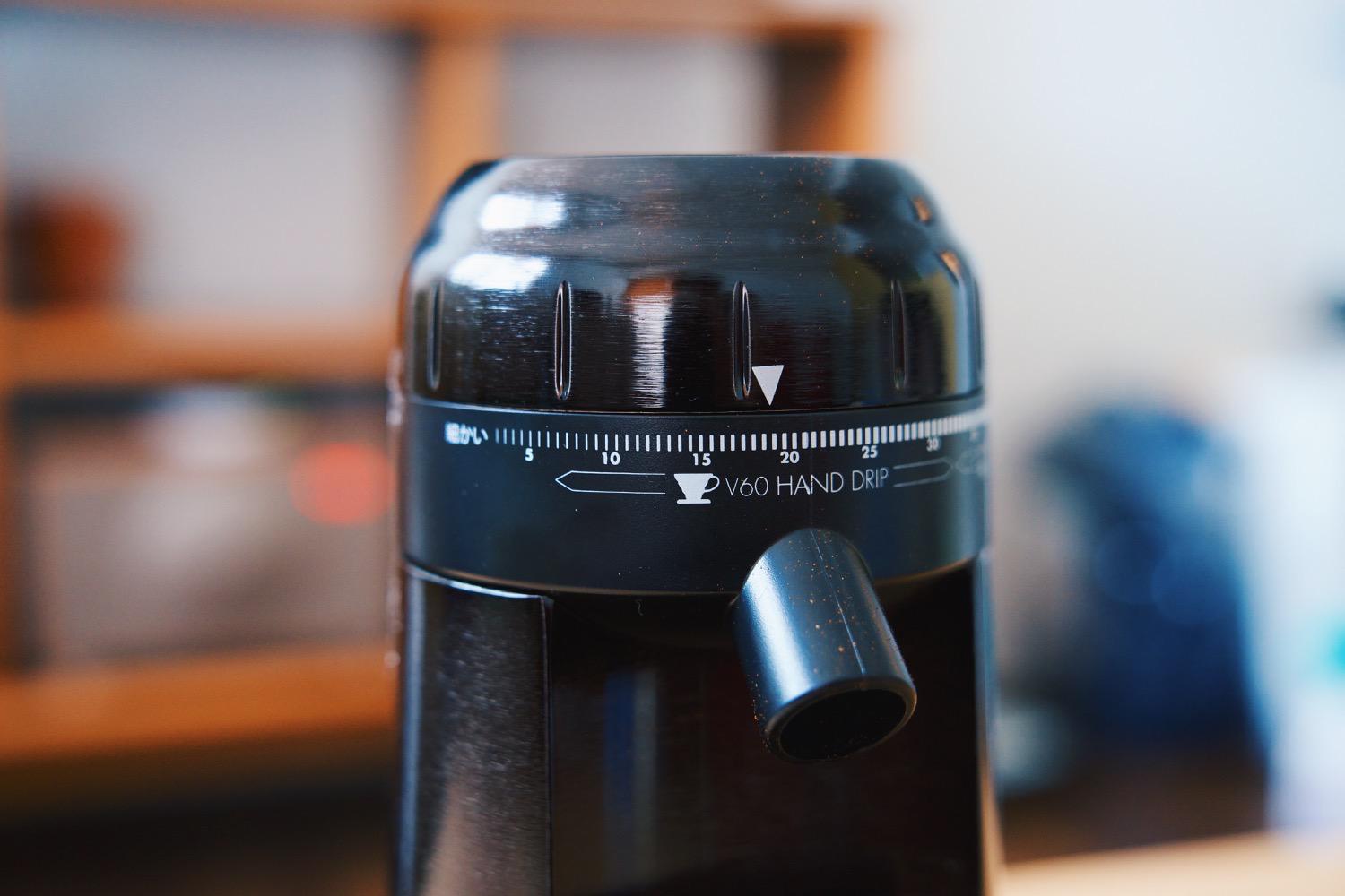 上部はダイヤル式になっていて、豆を挽く粗さを44段階もの細かさで調整可能。ぼくが普段使っているMelittaの電動ミルは調整が4段階なので、V60 電動グラインダーはその11倍!豆に合わせて気分に合わせて、細かく自分の好みを設定できます。