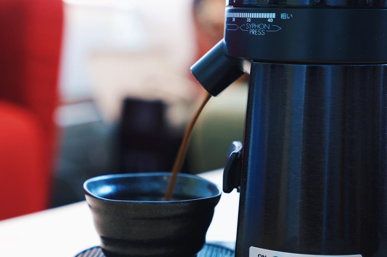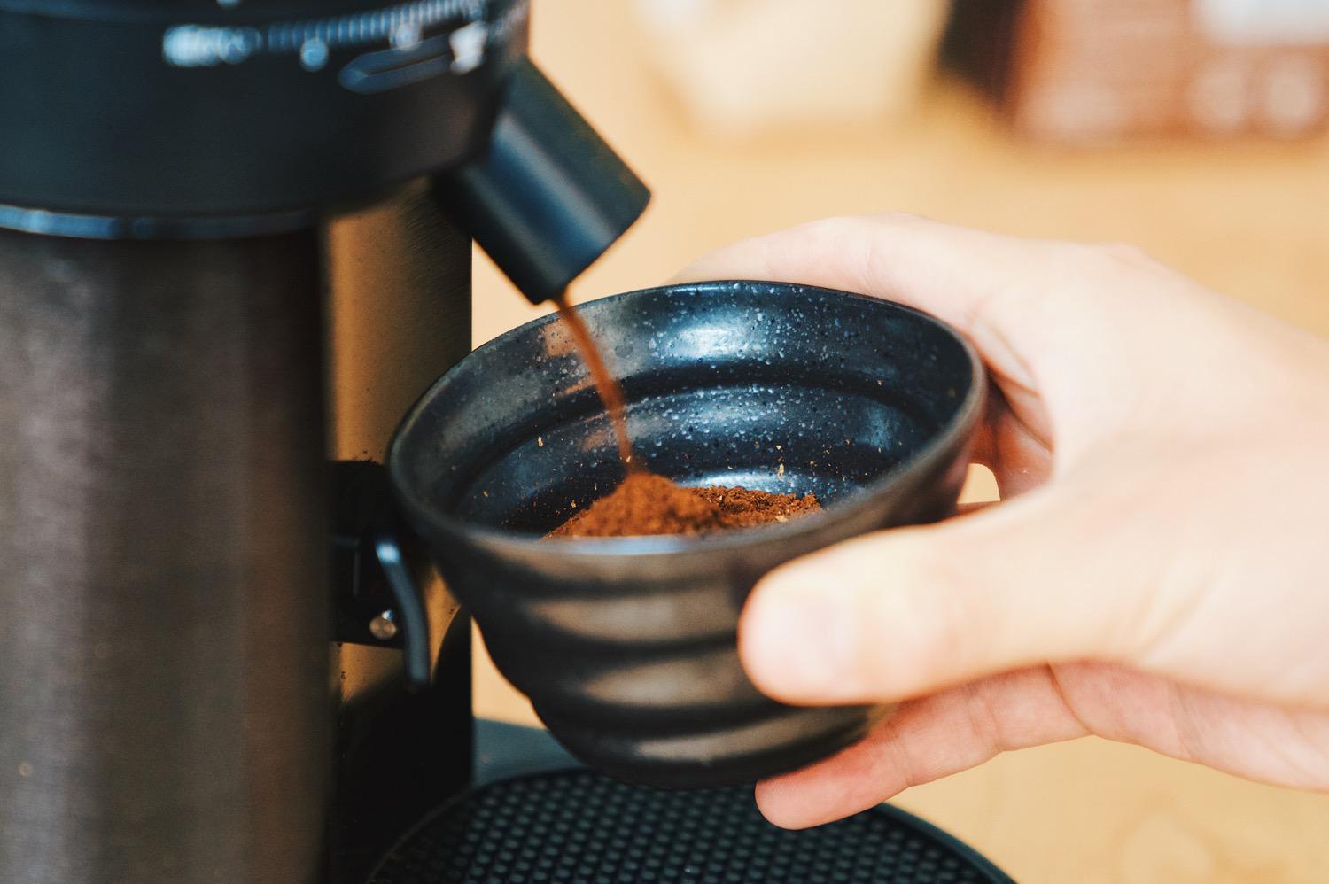 さらに電源をAUTOモードで入れておけば、受け皿でスイッチを押している間だけ豆を挽いてくれます。今回は撮影用にカップを使いましたが、直接ドリッパーに豆を注ぎ込むという使い方もできます。