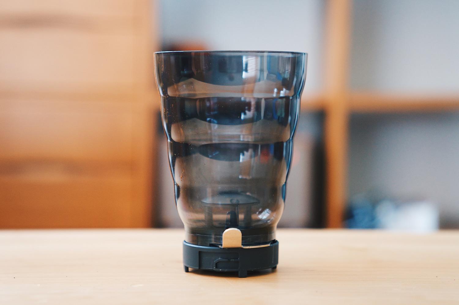 ぼくの使っているモデルでは挽いた豆が豆受け内に散乱して静電気で壁面に付着したり、豆受けの外にも溢れてしまったりするのですが、これは非常にスマート。