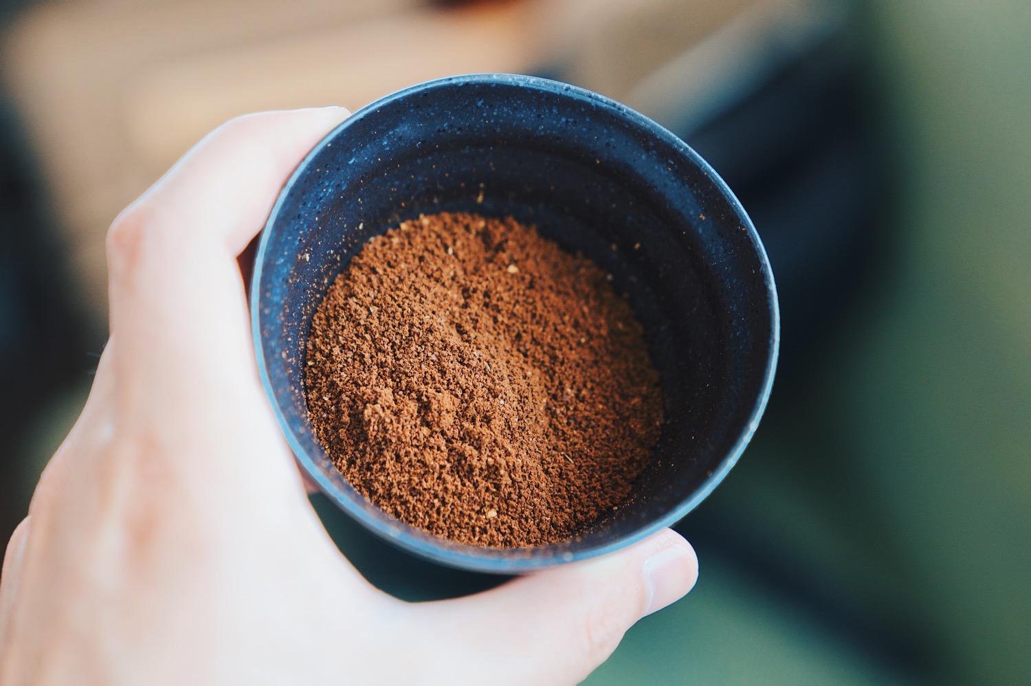 挽き終わった豆がこちら。V60 電動グラインダーは粒度が一定に挽ける臼式ミル歯を採用。細かく調節した粗さに沿って均等に豆を挽いてくれます。