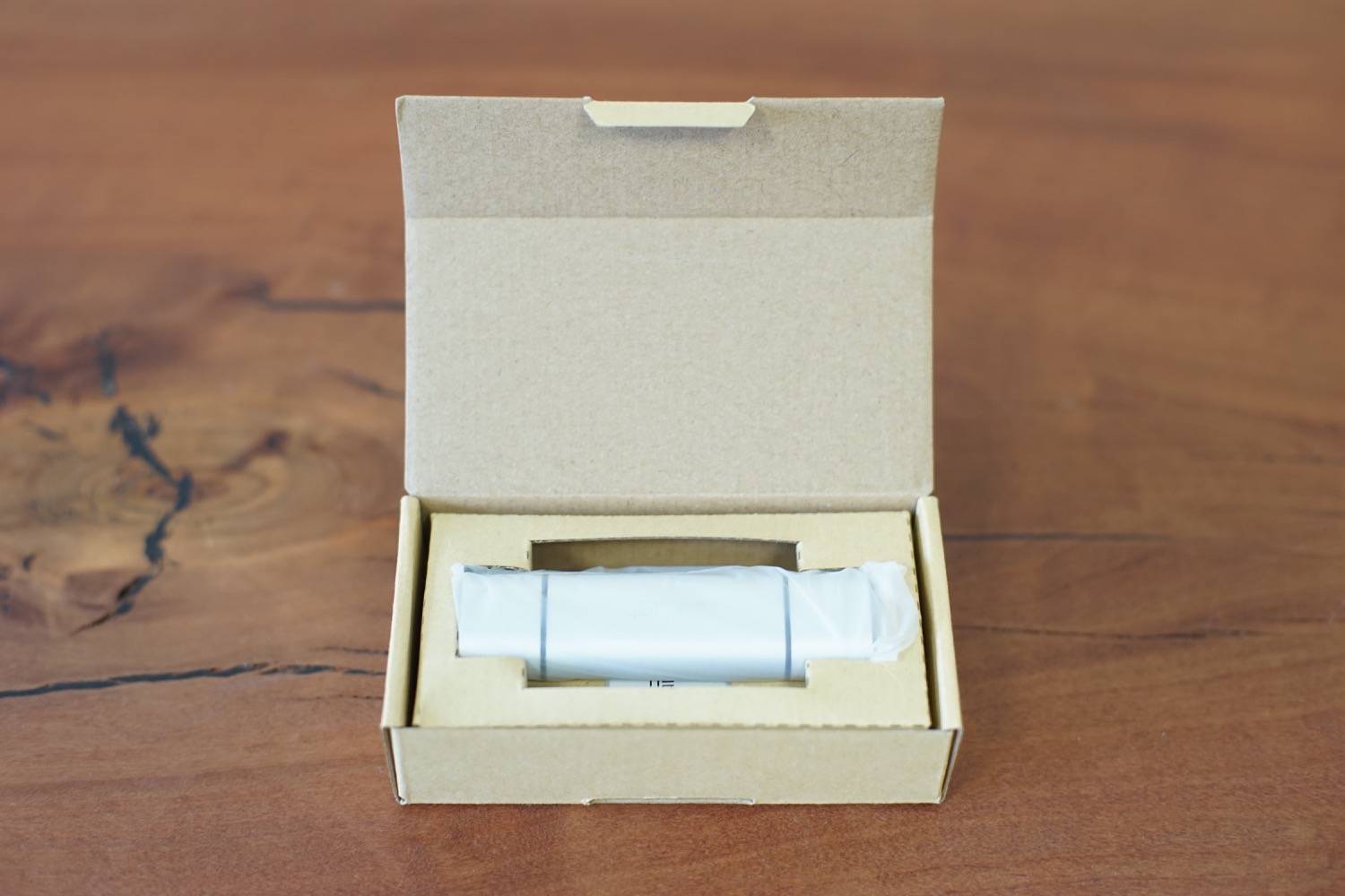 最近のガジェット周辺機器ですっかりおなじみの簡易的なパッケージを開くと本体登場。きちんと内袋にも包まれていて、粗雑な商品ではなさそう。