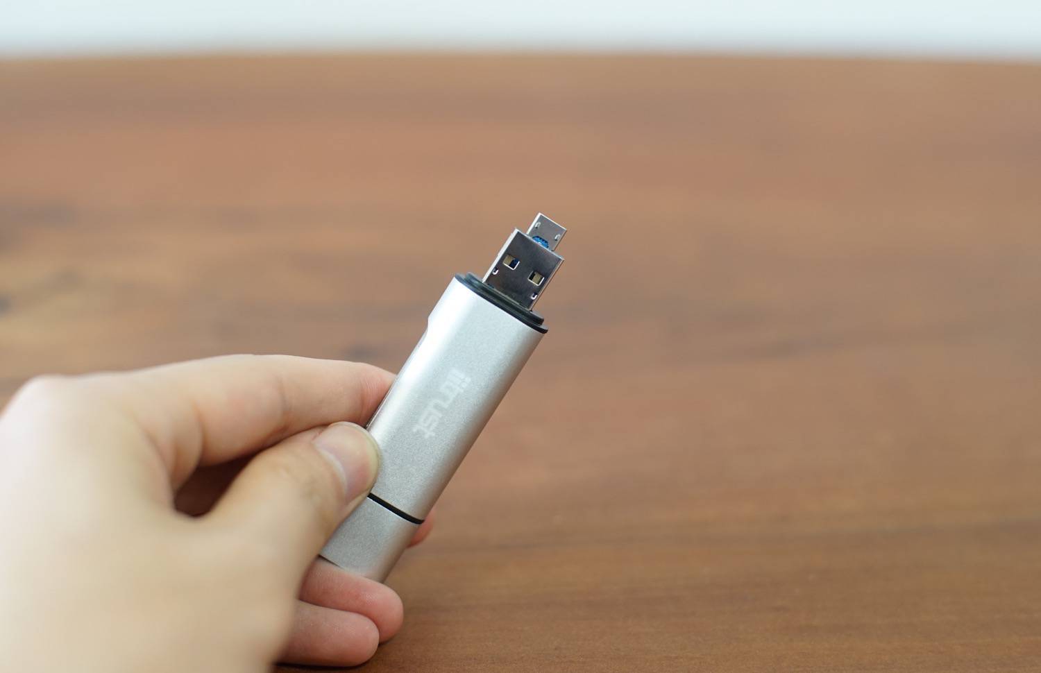 さらに反対側のキャップを開くとUSB3.0コネクタが。両端にコネクタを付けるという工夫は本体のコンパクト化にも貢献していて素晴らしい。