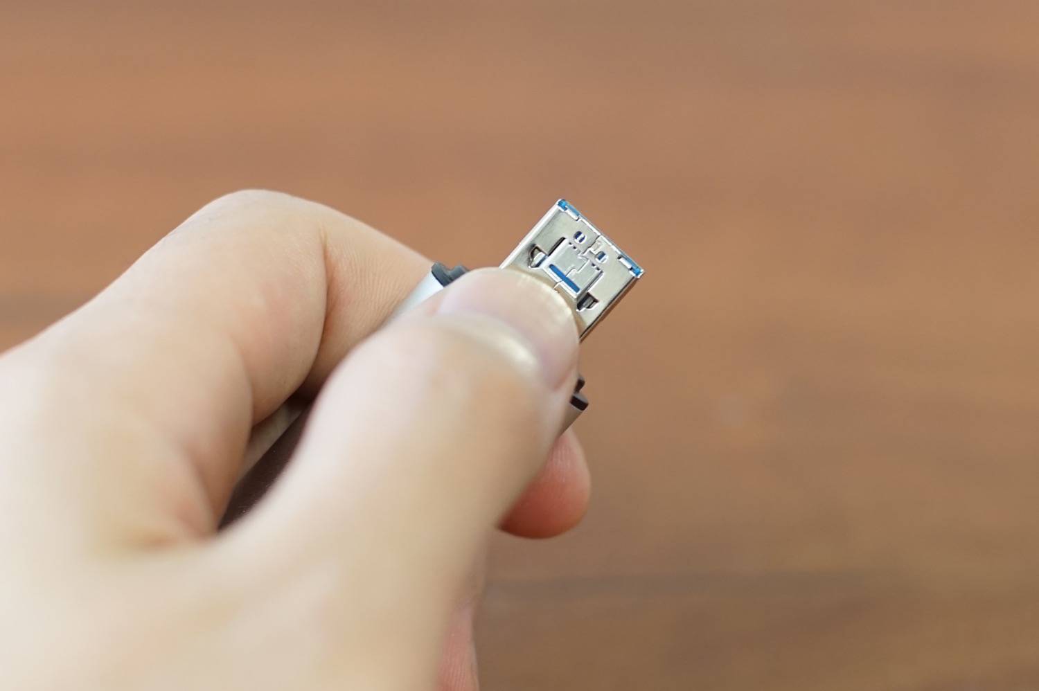USB3.0の裏側は写真のような作りになっているので、まずはブルーの細長い部分を爪で抑えて上へスライドさせます。