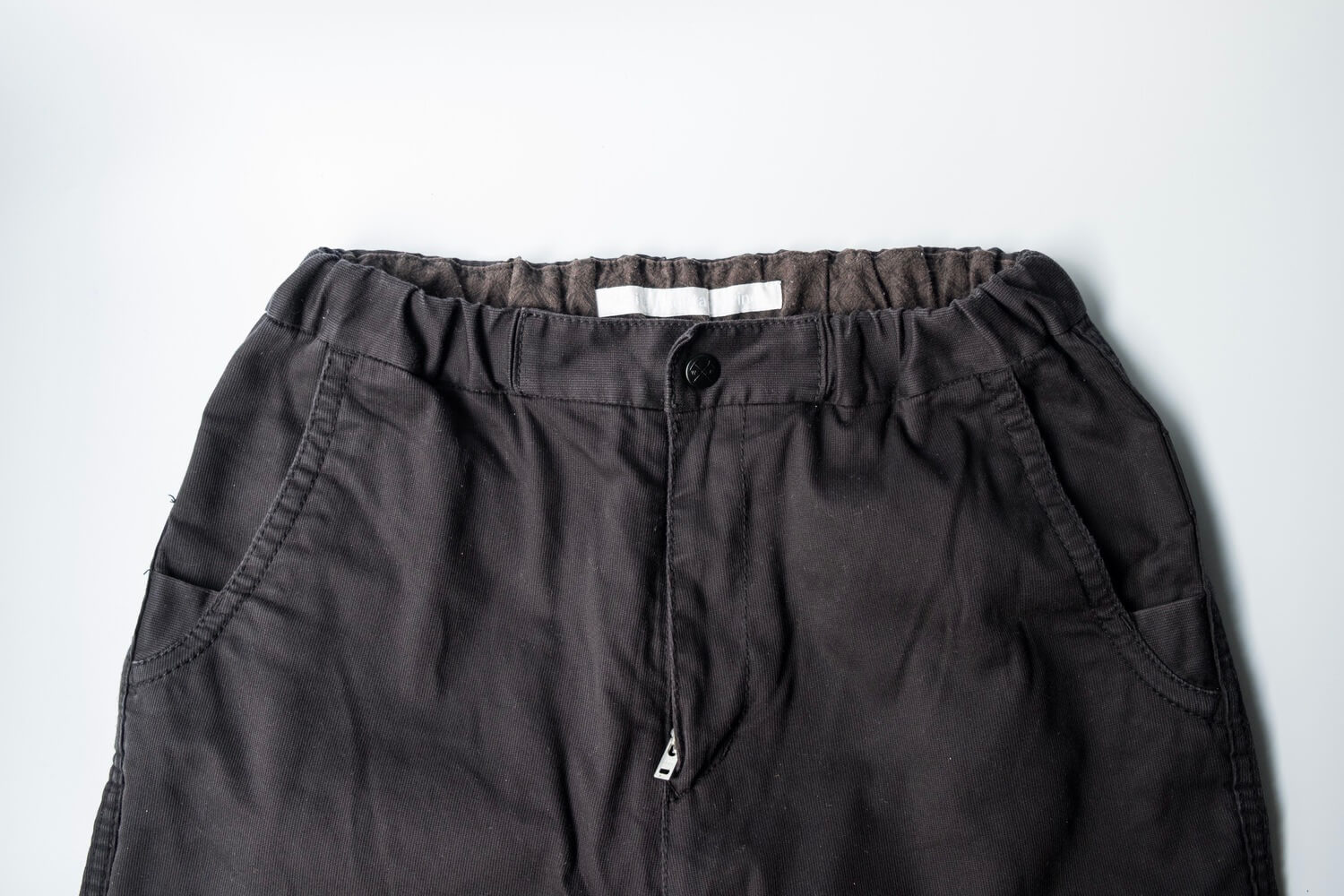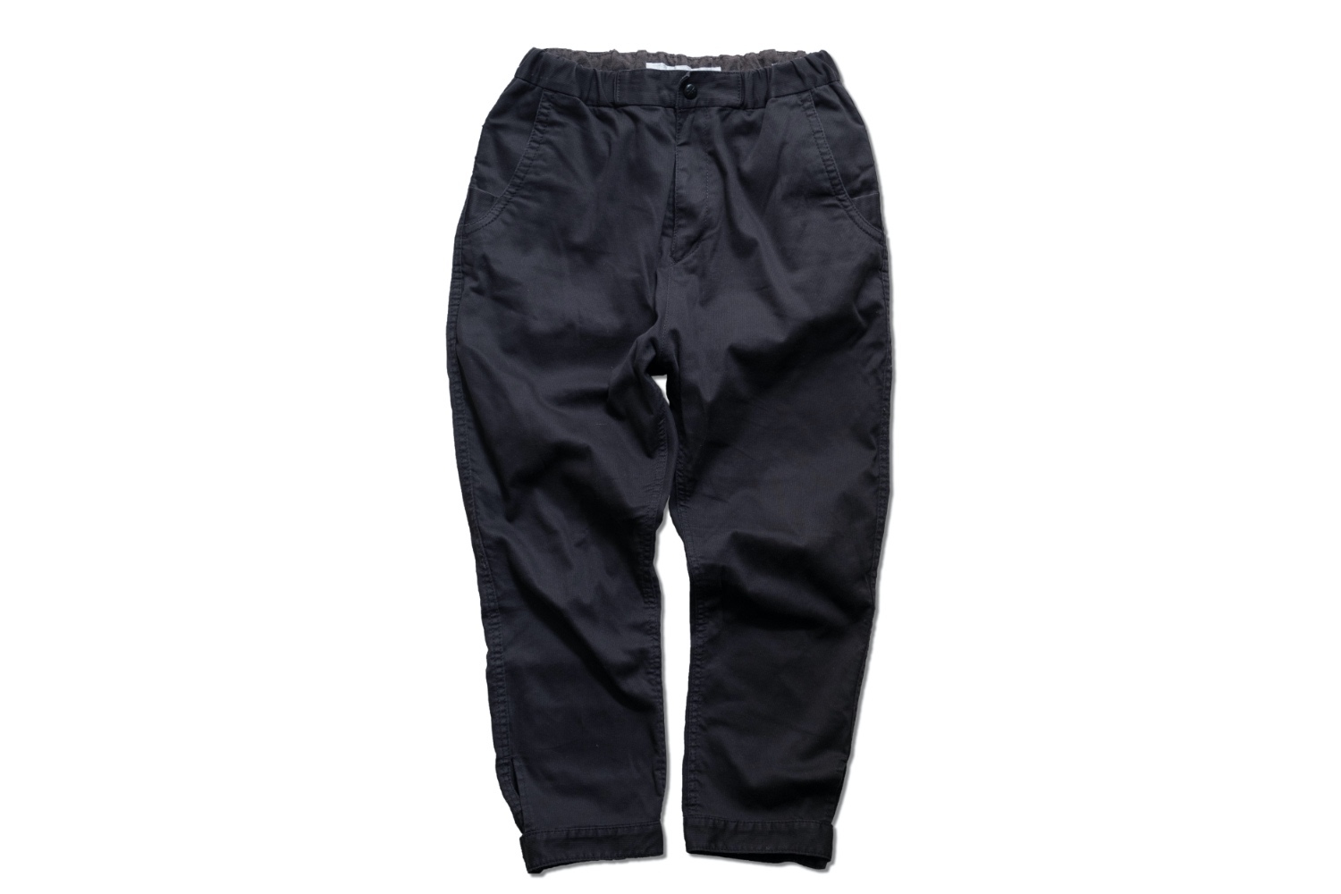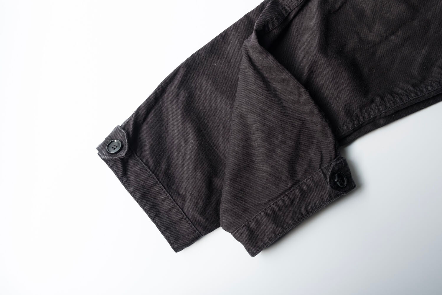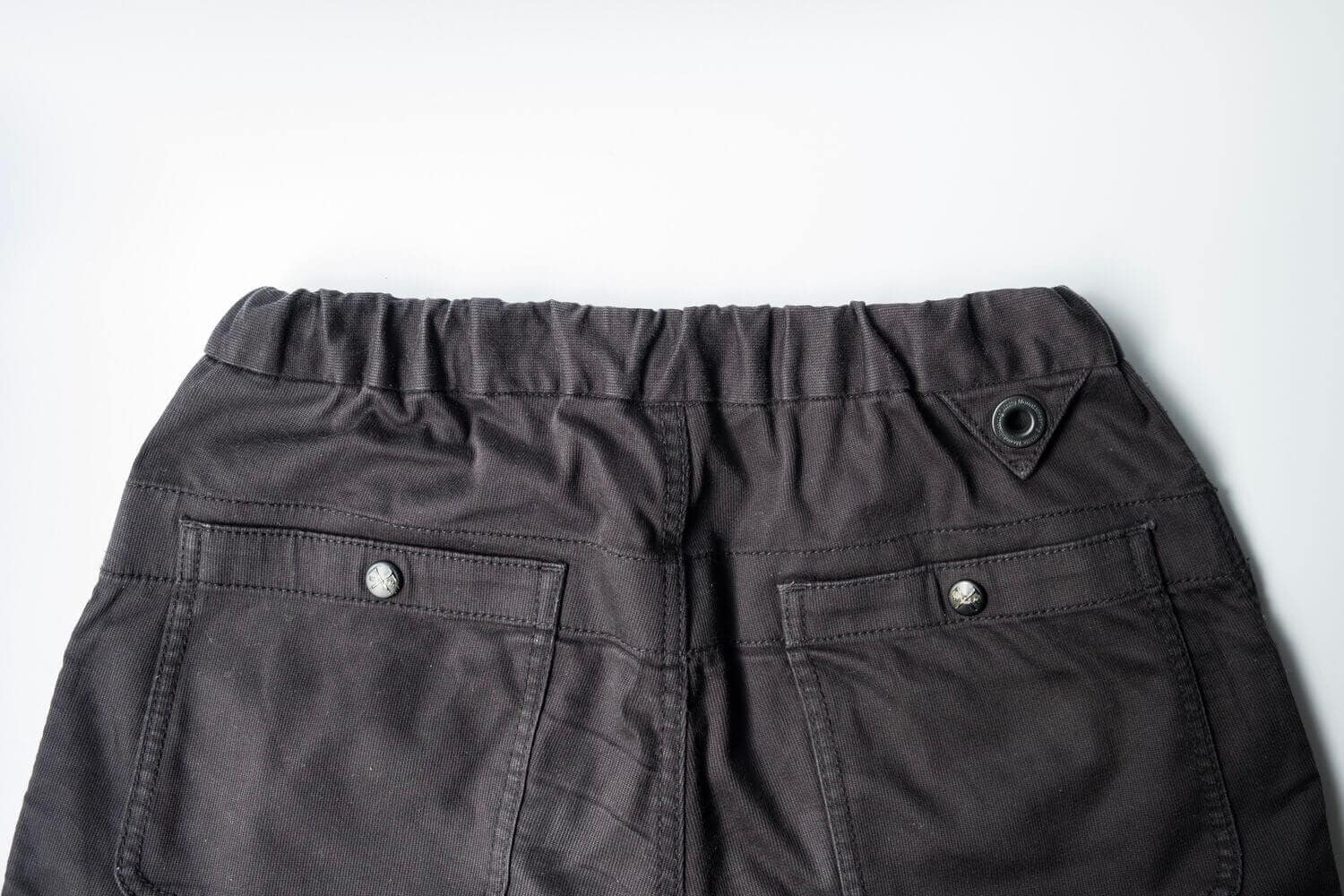ウエストはゴム仕様でストレスフリー。フロントボタンやバックポケットのボタンは全て同ブランドオリジナルのものが使われています。さらにボタンは全てマットブラックでコーティングされ、ミニマルな印象。