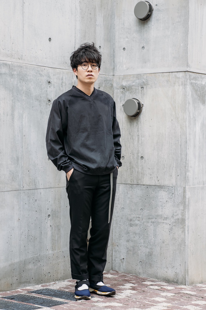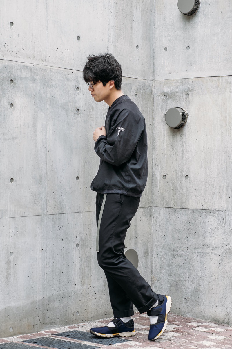 元はスポーツウェアとして作られた服ですが、ゆったりした作りや少し光沢のある生地感で着るとモードライクにハマる1着です。