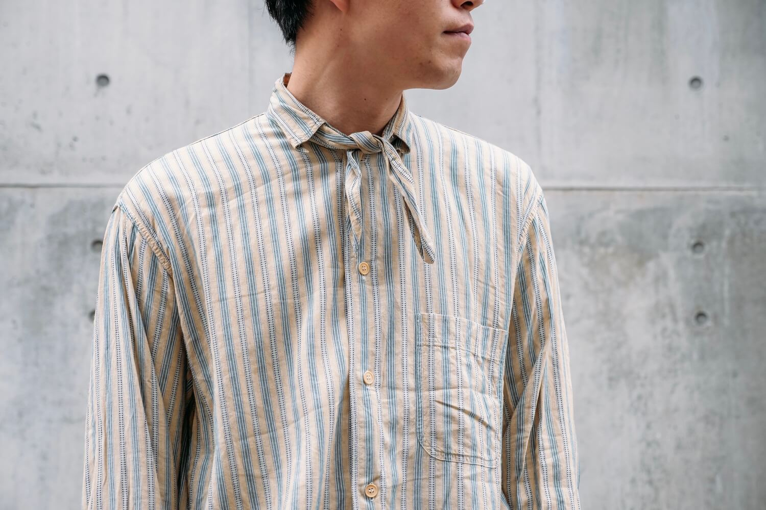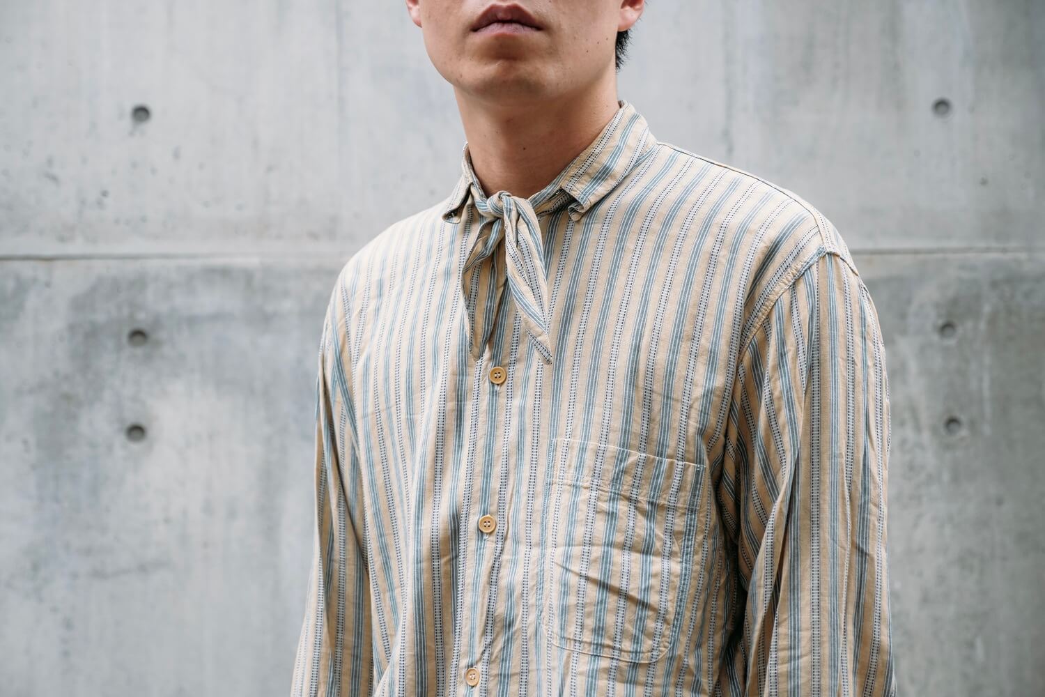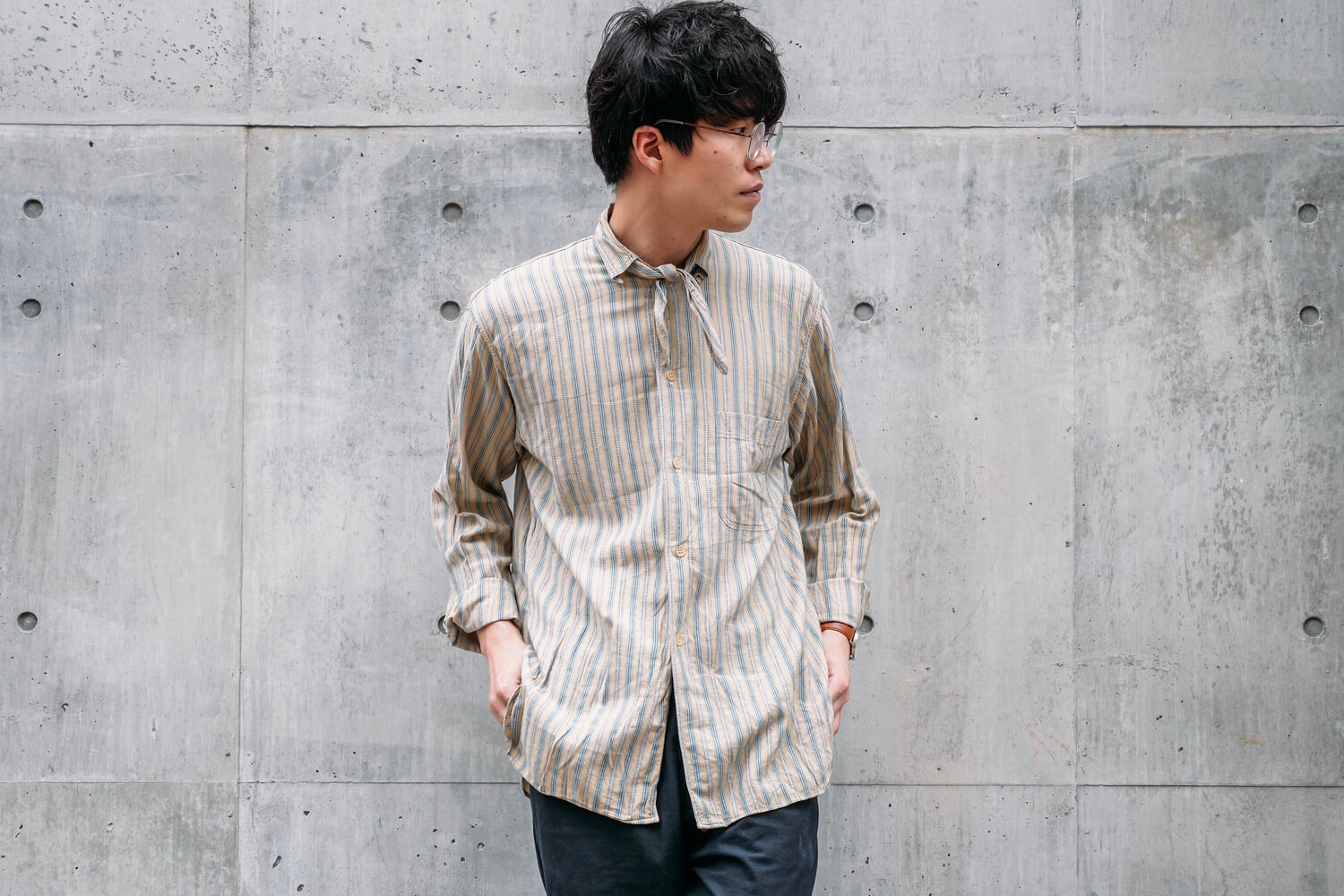 紹介するのはベージュとブルーのコンビカラーがヨーロッパテイストを思わせる、ストライプシャツ。