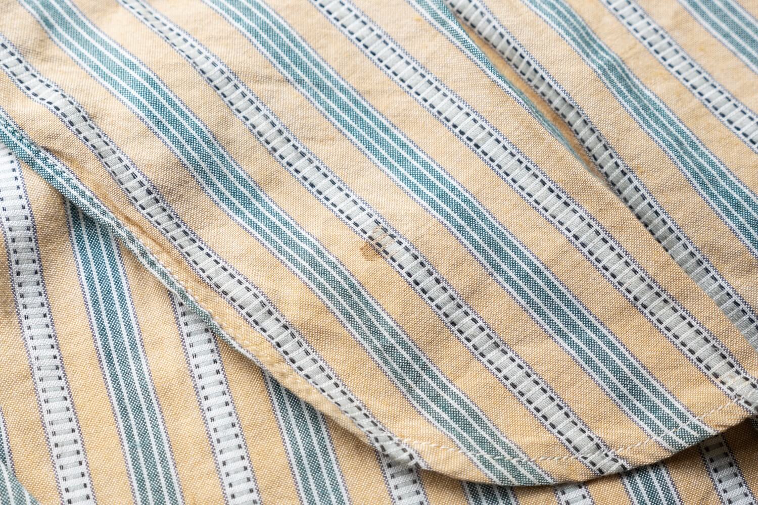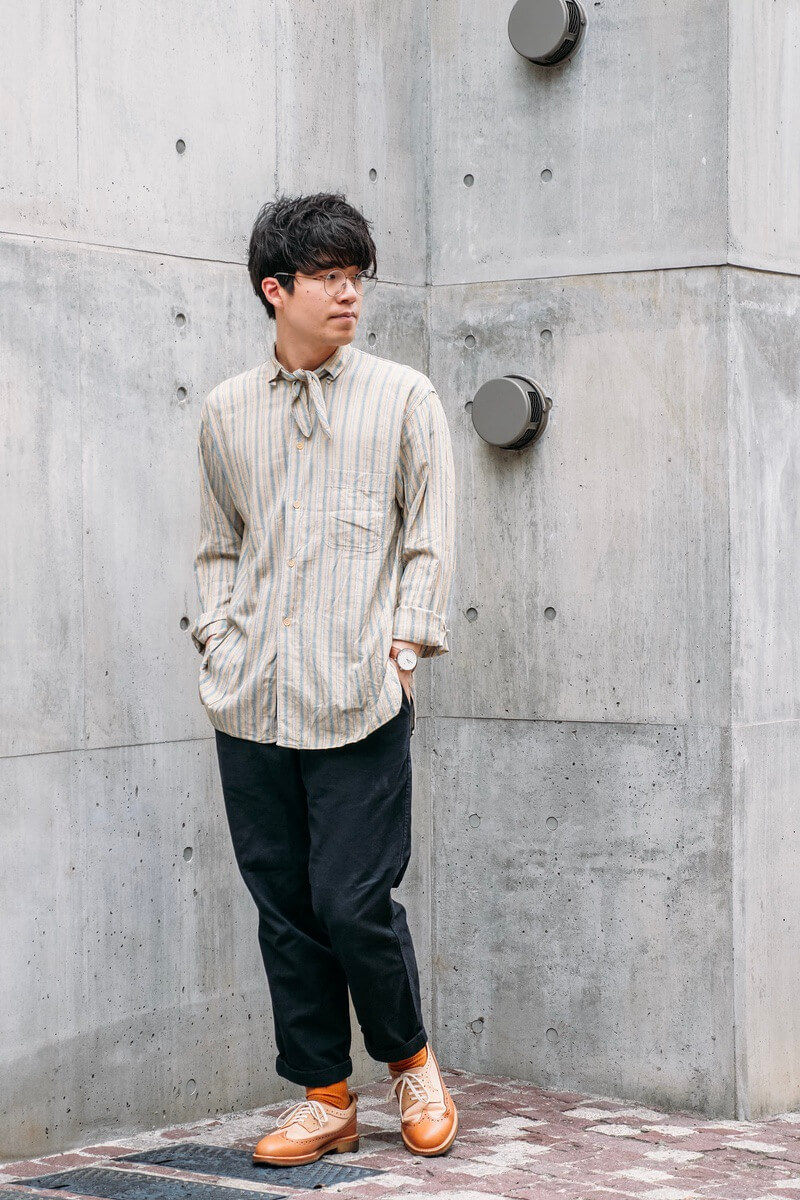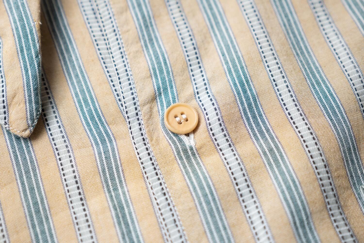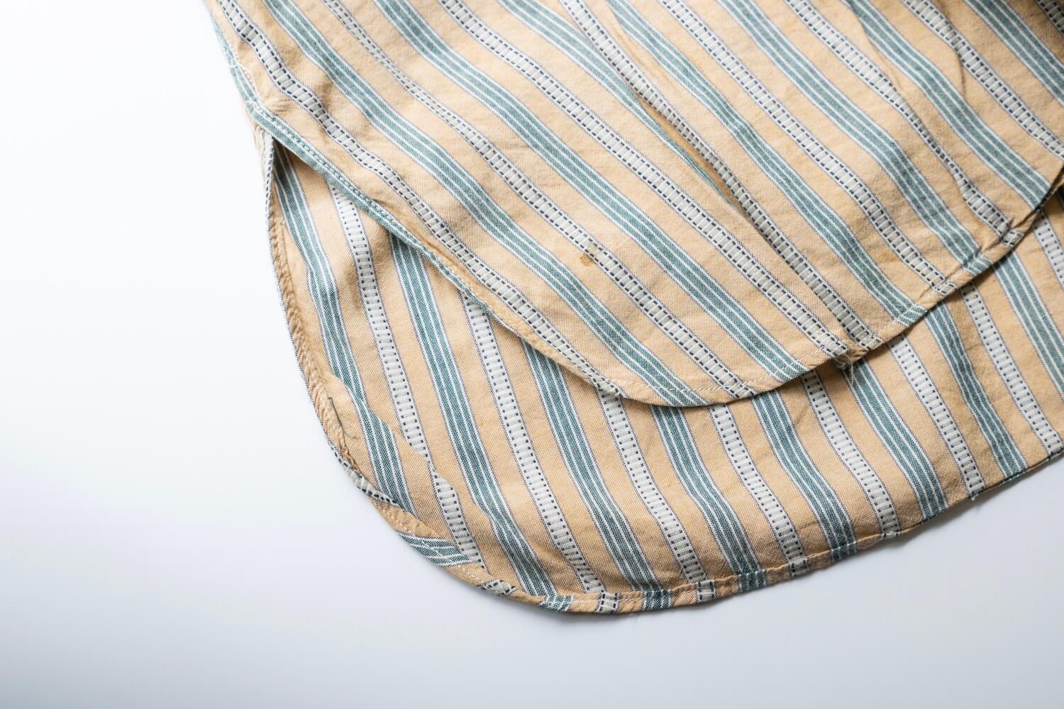 紹介するのはベージュとブルーのコンビカラーがヨーロッパテイストを思わせる、ストライプシャツ。