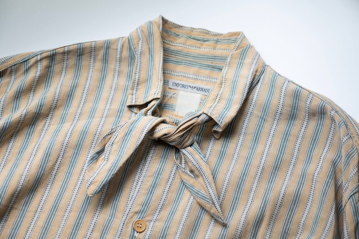 その色柄もさることながら、このシャツの最大の特徴は首元にくっついたシャツと共地のリボン。