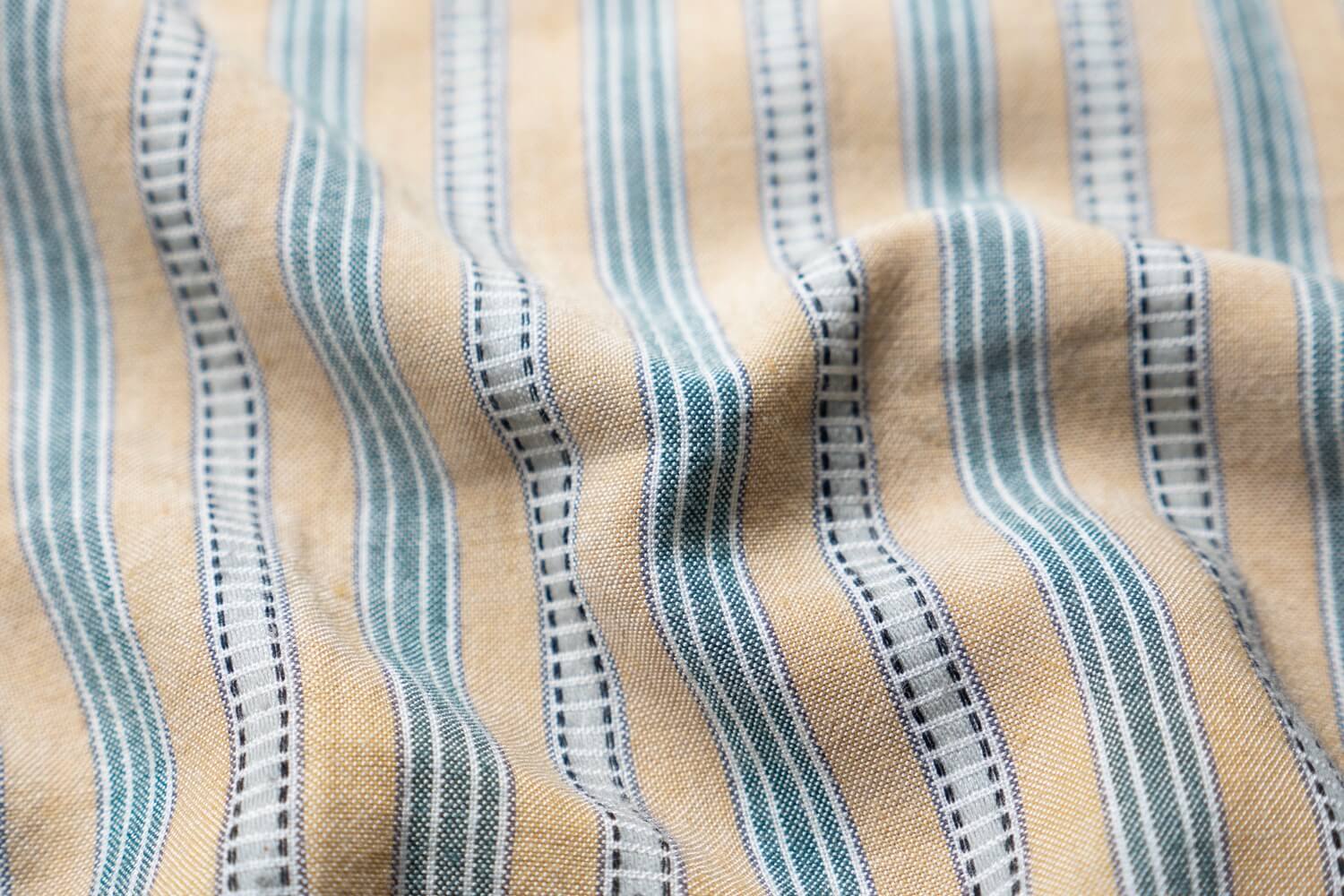 薄手のコットン素材で、ベージュ地に種類の異なる2種類のストライプが走るハイセンスなテキスタイルが特徴。