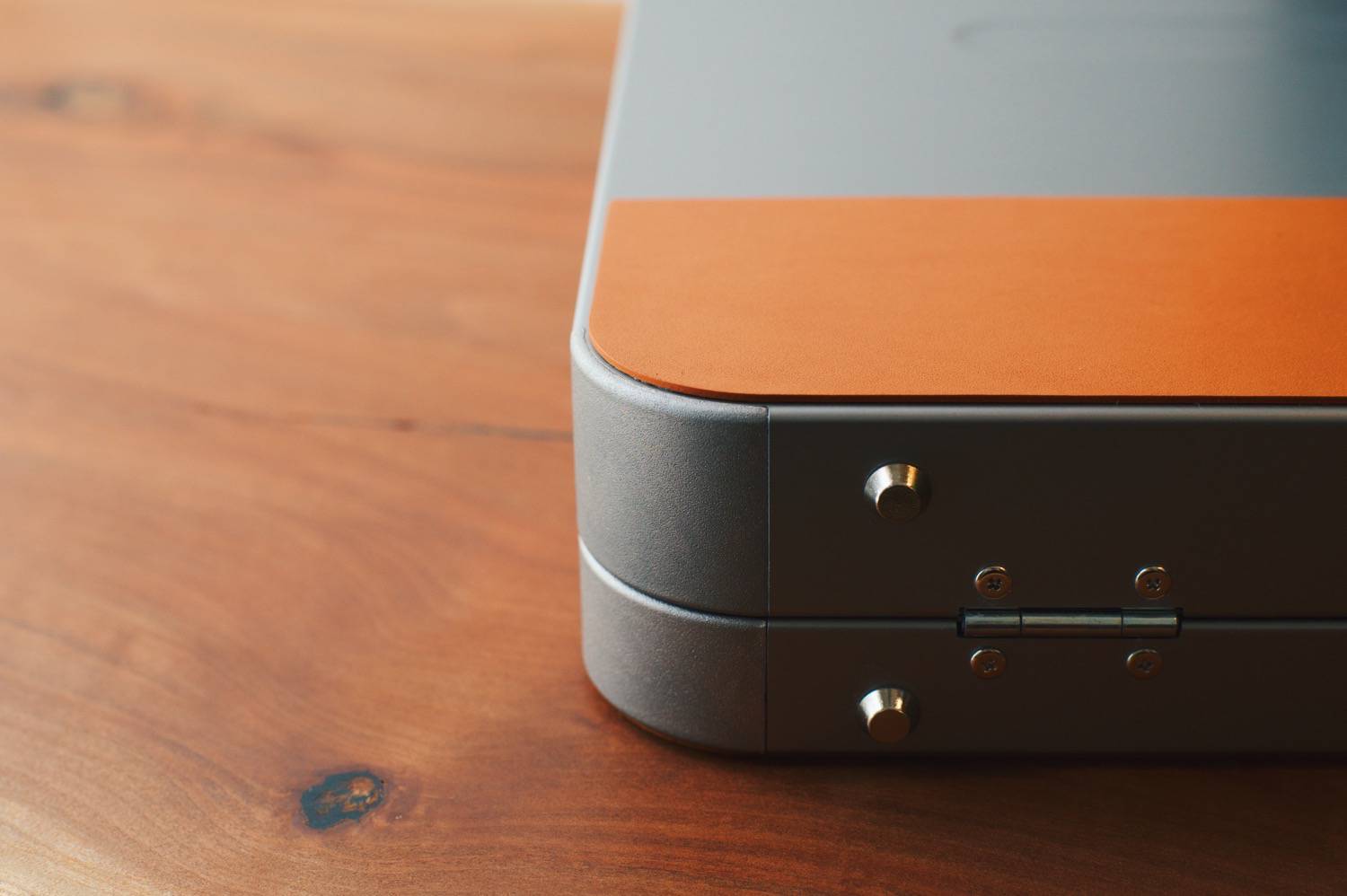 アルミニウム合金と本革を用いた大胆な素材使いで、クラシックながらもエッジな雰囲気のボックスに仕上げています。