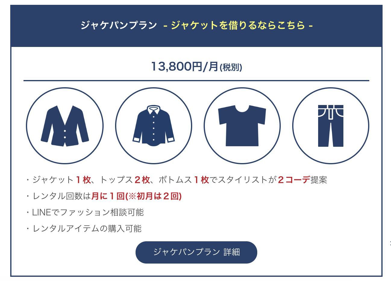ジャケパンプランは月額13,800円(税別)で、ジャケット1枚・トップス2枚・ボトムス1本の4着をレンタル可能。