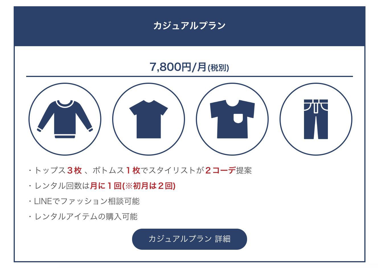 対するカジュアルプランは月額7,800円(税別)でトップス3枚・ボトムス1枚の4着を使って、スタイリストが2コーデを提案。