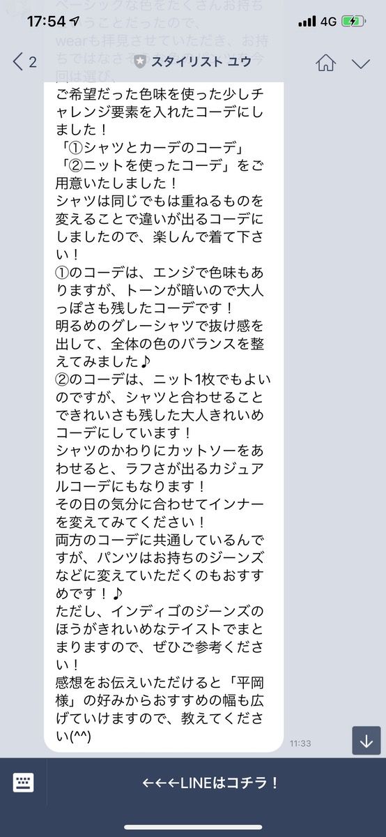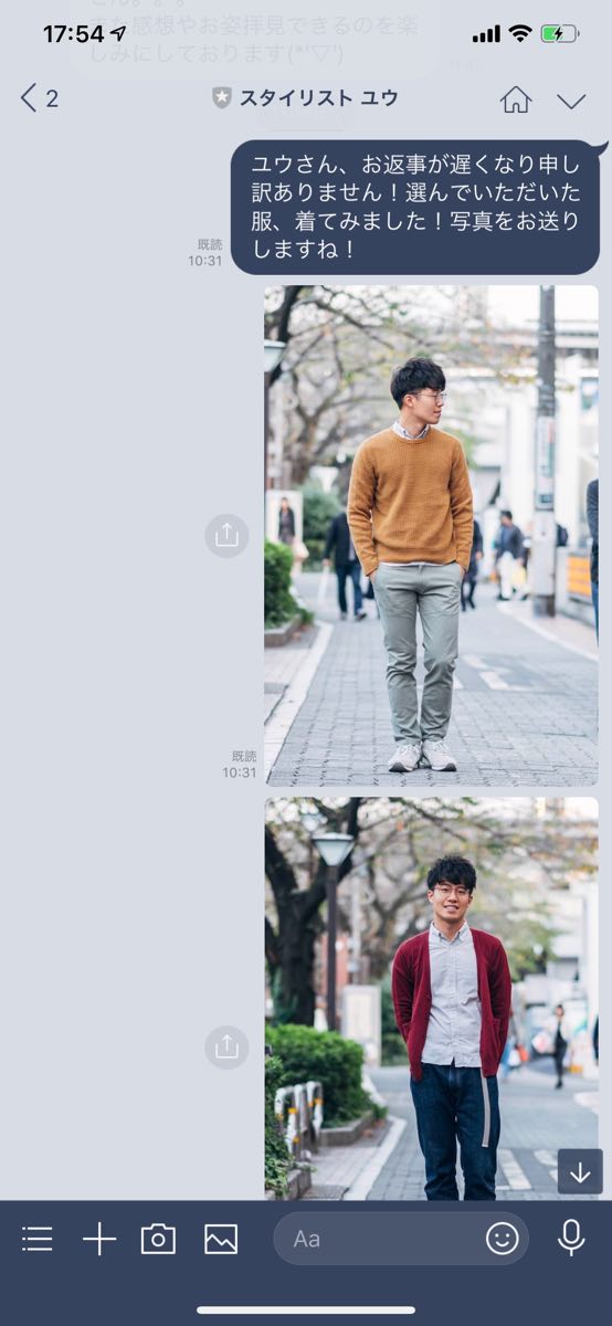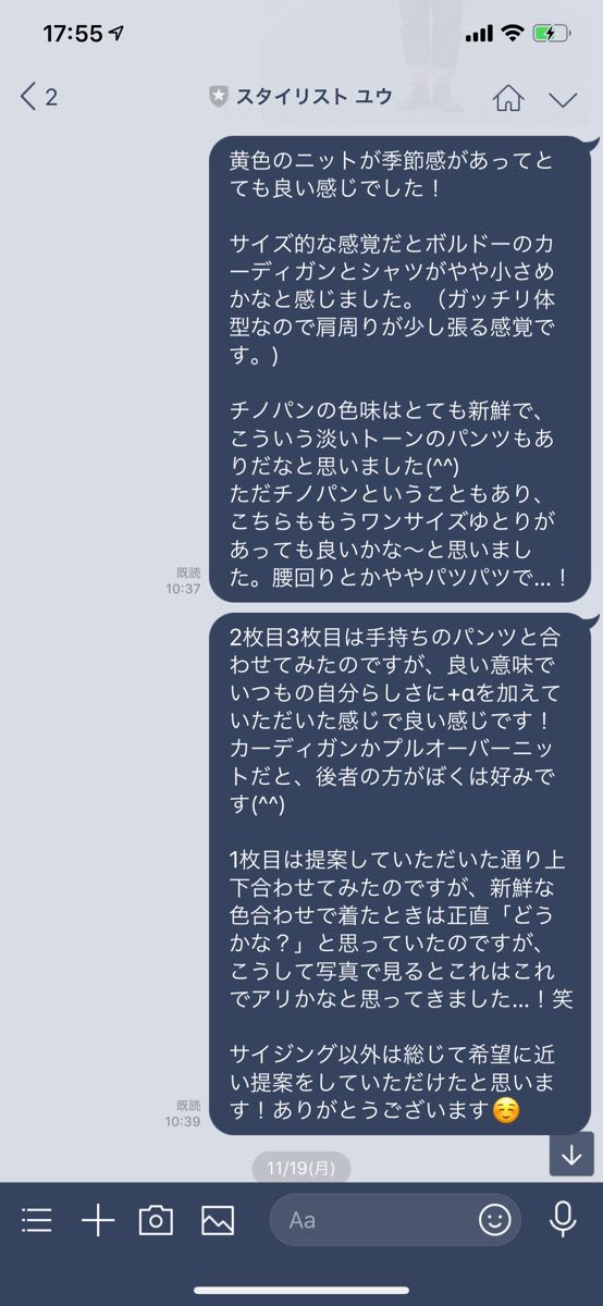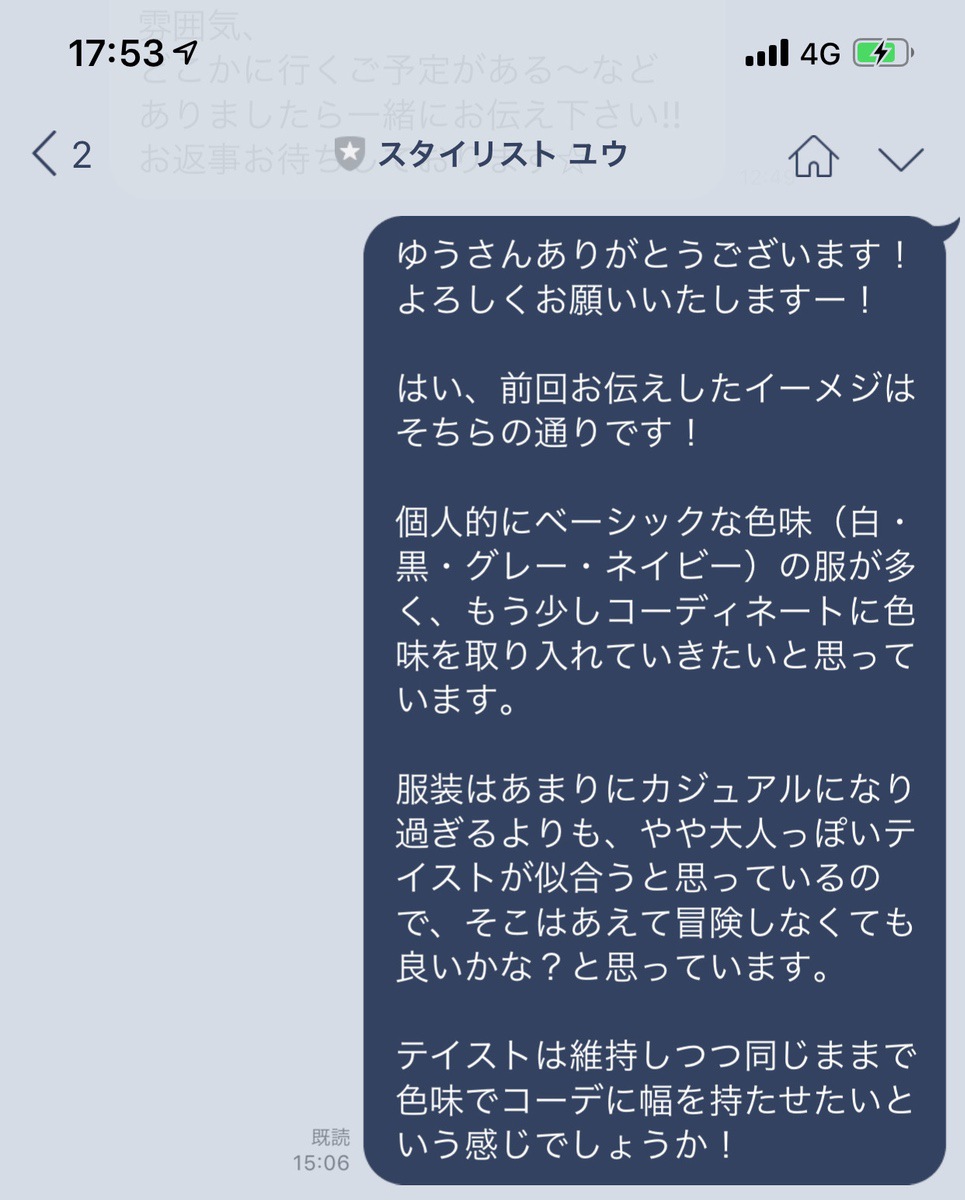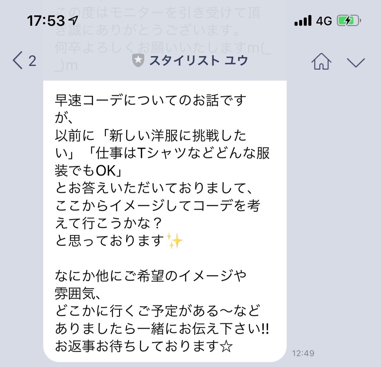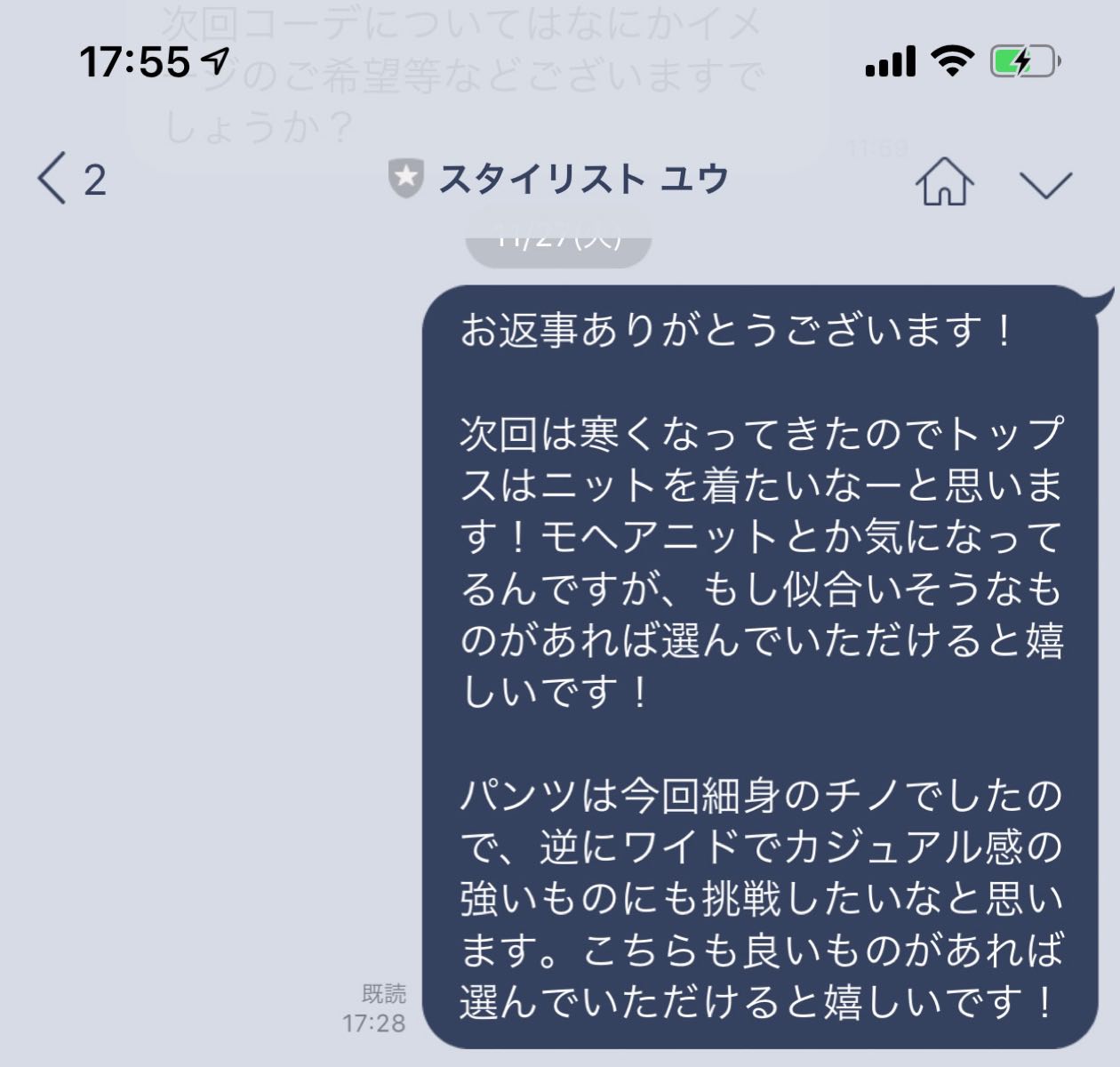 かなり丁寧なやり取りで、かつきちんと人柄が感じられる文面なのが好印象。パーソナルスタイリストみたいな感覚ですね。