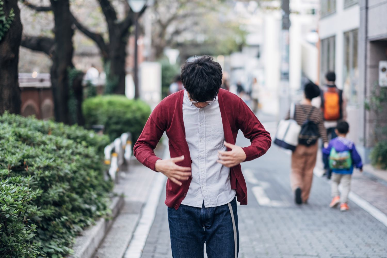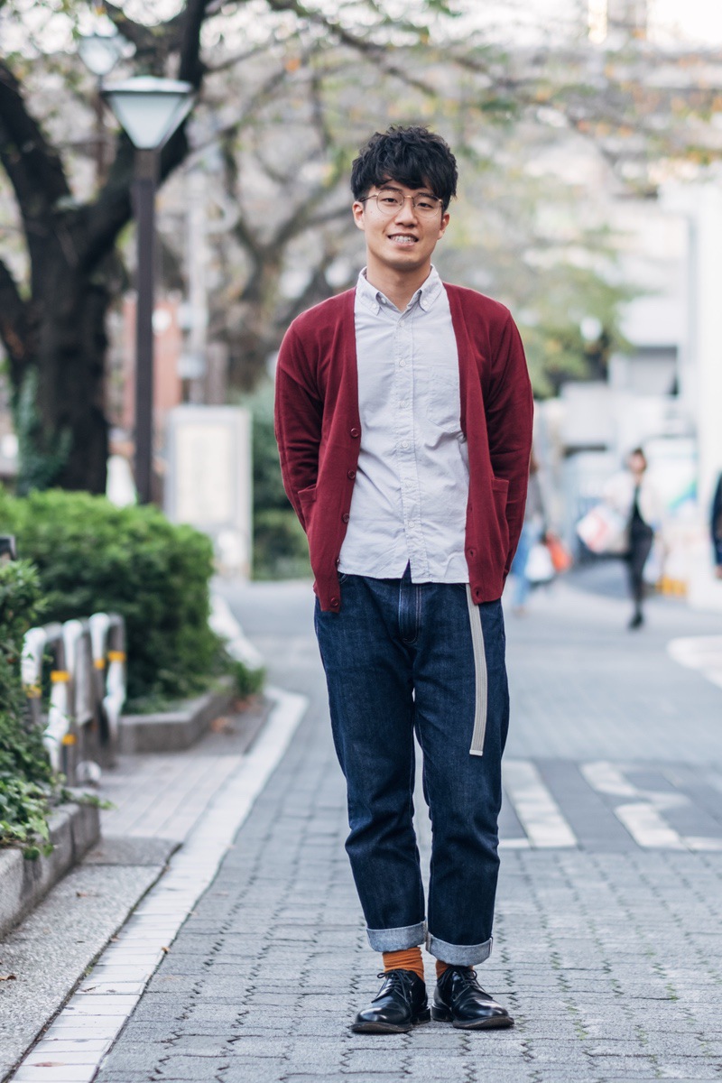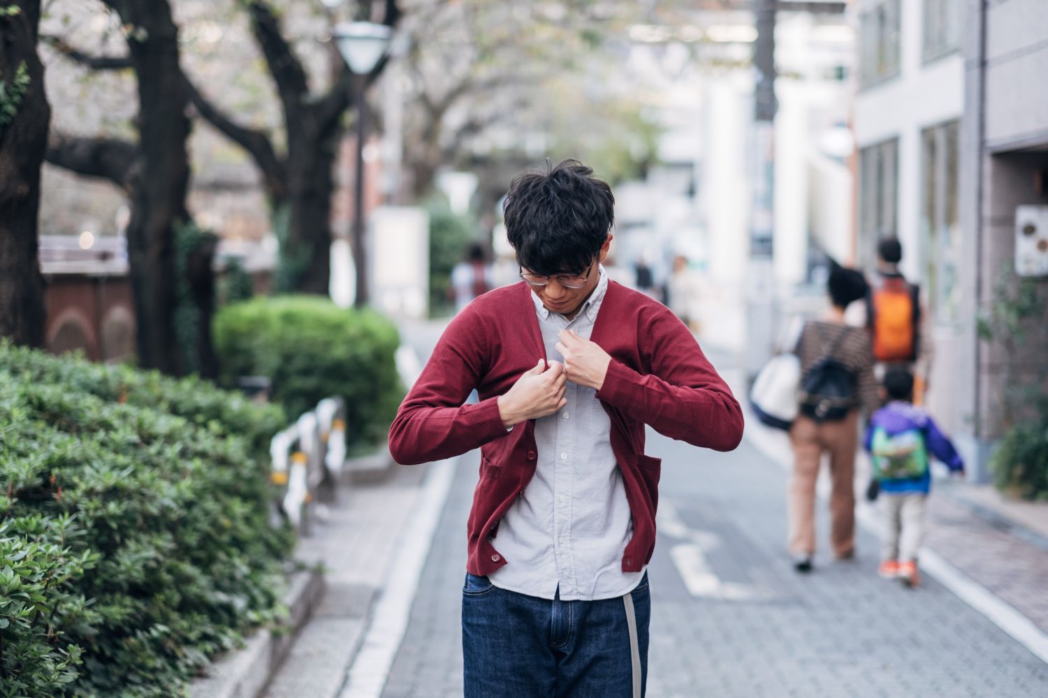サイズ問題は置いておいて着用した雰囲気はこんな感じ。ボルドーのカーディガンは新鮮だけど、ちょっと子供っぽいというか大学生感?があるような…。(どうですかね?)