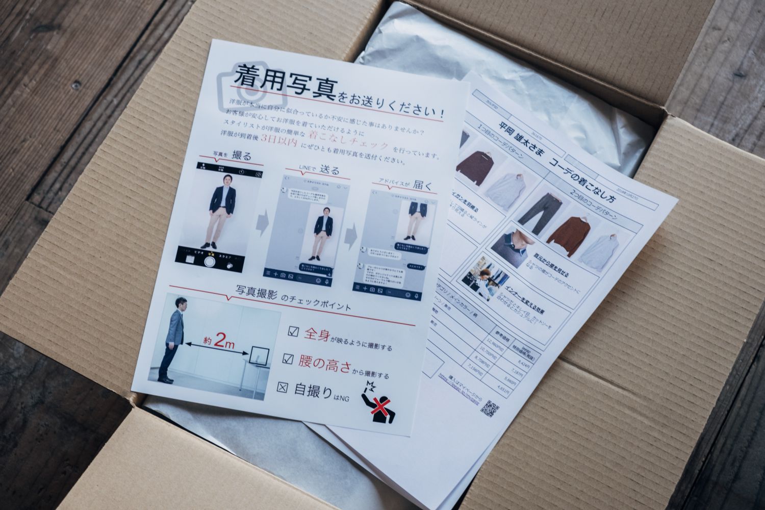 メッセージでレンタル品の発送連絡から2〜3日後、ダンボールで服が届きました。サービスの流れを説明した紙と、今回のコーディネートの着こなし方の資料が同封されています。