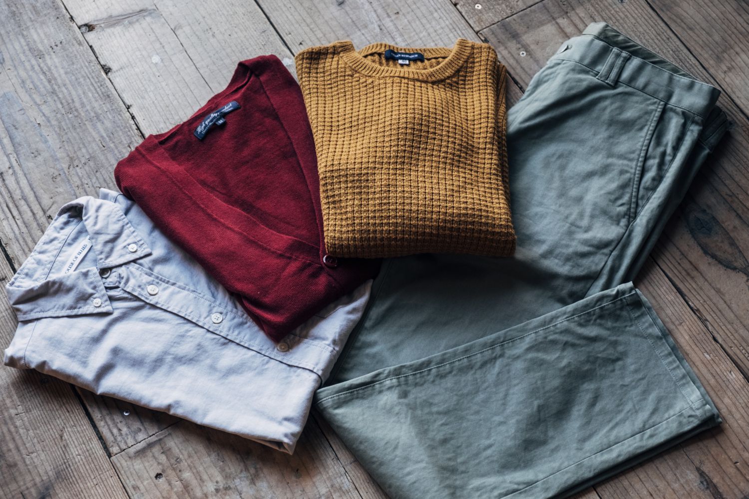 パンツとカーディガンはサイズが合わずでしたが、シャツとからし色のワッフルニットは気に入りました。パンツを私物に変えてソックスの色を揃えるといい感じ。