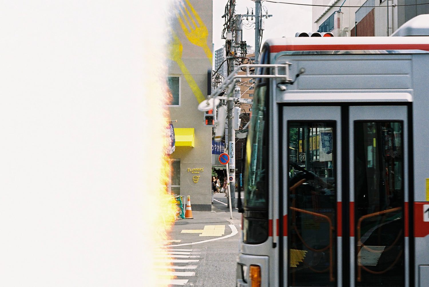 慣れないうちはフィルムを引き出しすぎて、1枚目がこんな風に感光してしまうことがほとんどでした。コツとしては装填後に巻き上げ確認を行ったあとに、引き出しすぎているフィルムを巻き戻しクランクで軽く巻き戻すこと。