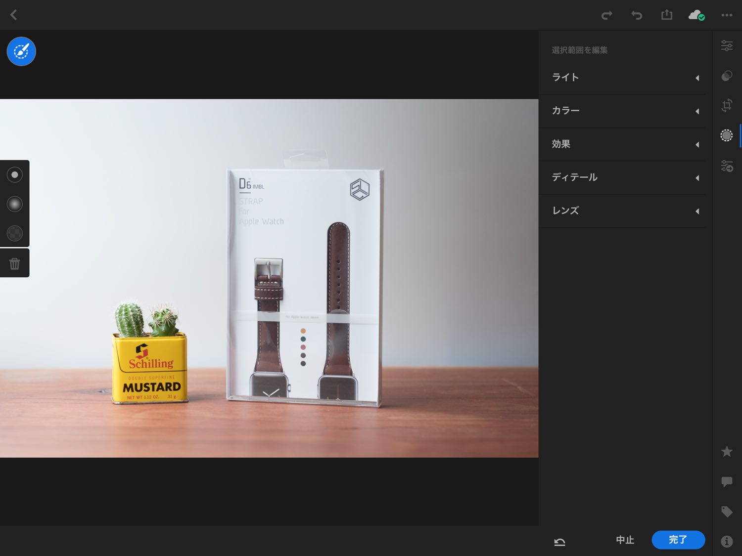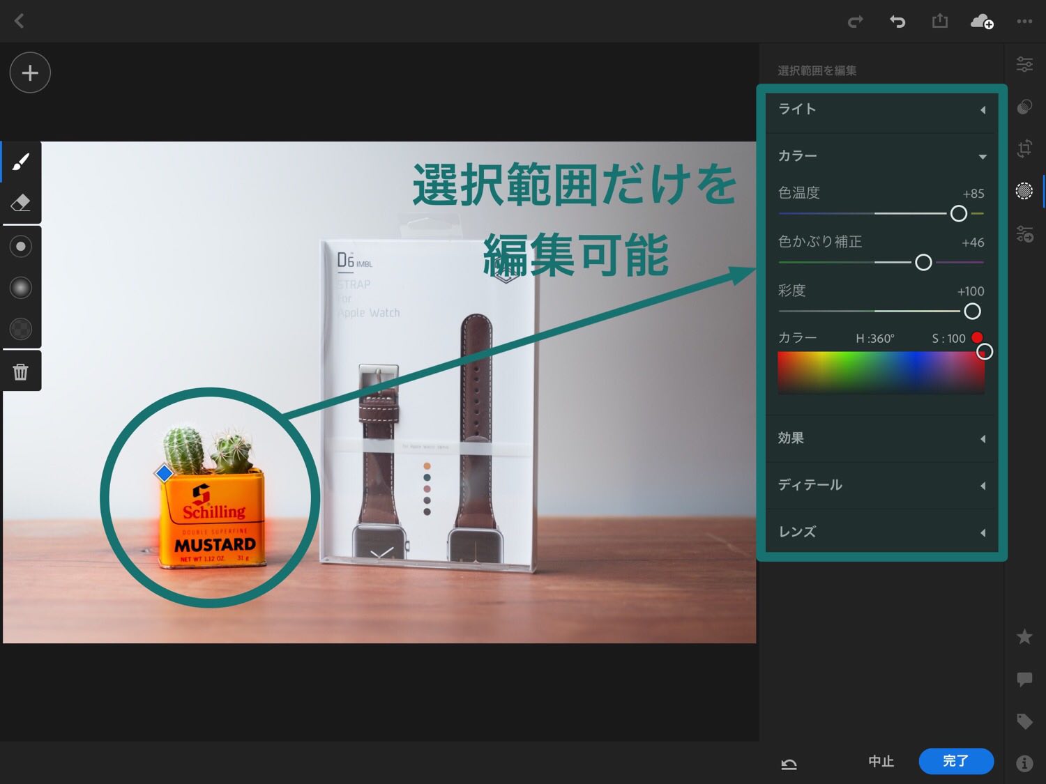 すると編集ツールが出現。そのままスライダーを操作することで選択した部分(上の画像ではサボテンの缶)だけを明るくしたり色味を変えたりできます。